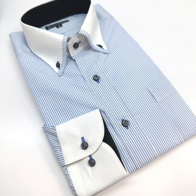 細身のストライプが衿先に1cm幅で入りますが、カフス衿裏、ボタンは紺、