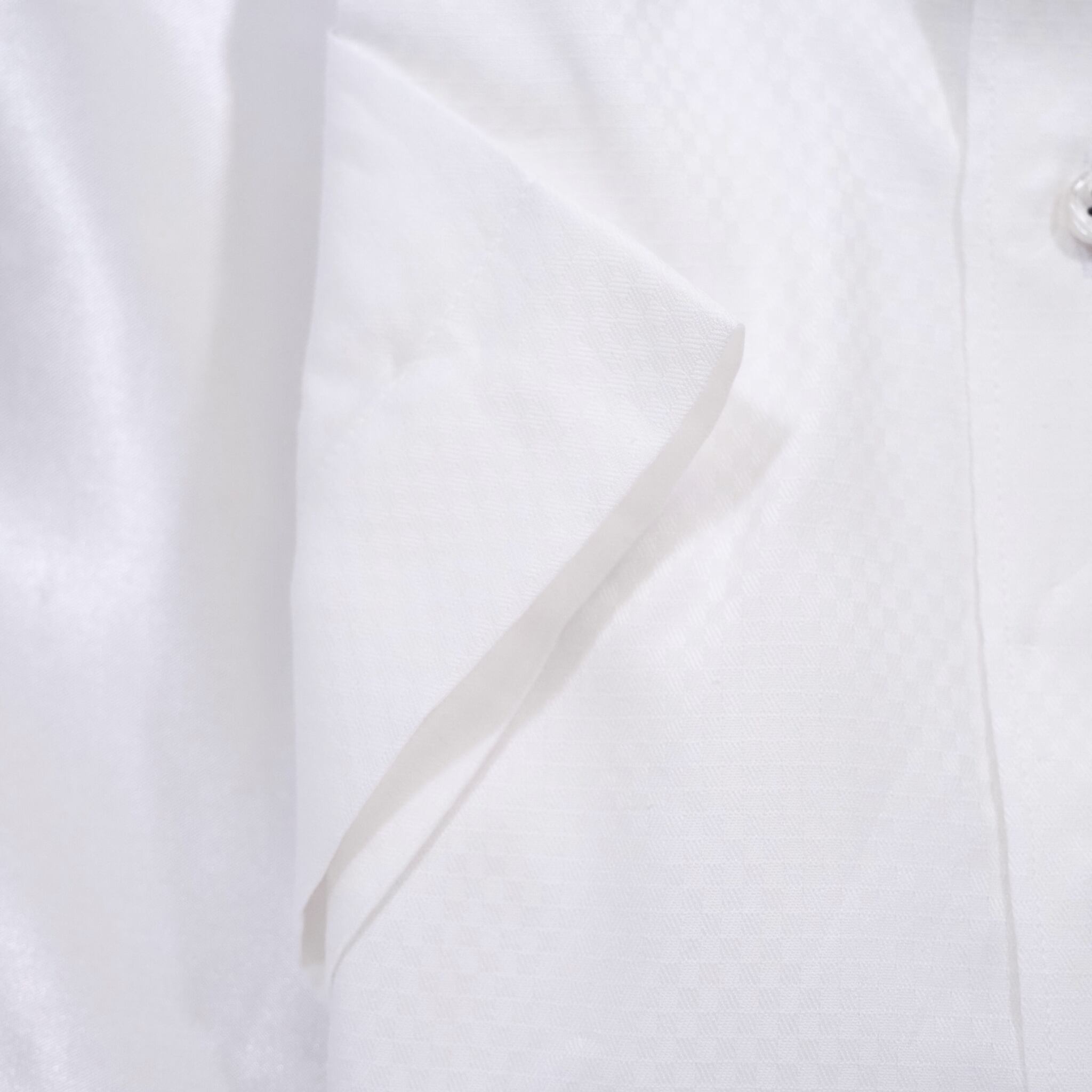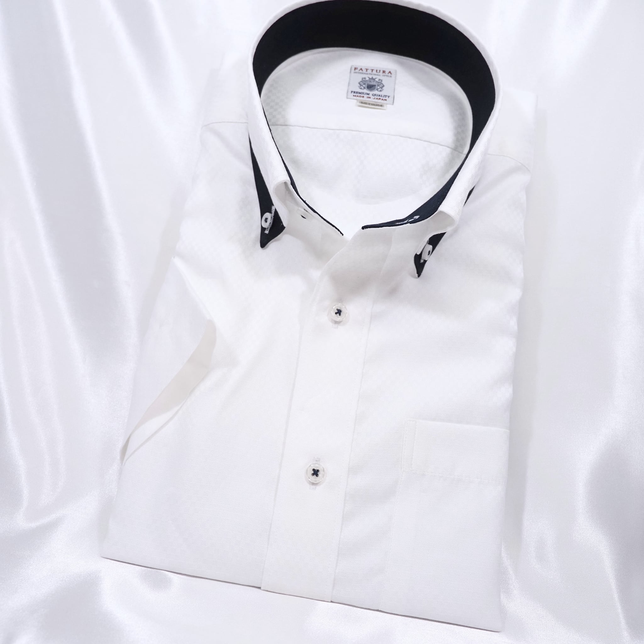 シャープな印象を与える、衿先スラントカラーの半袖シャツ。
