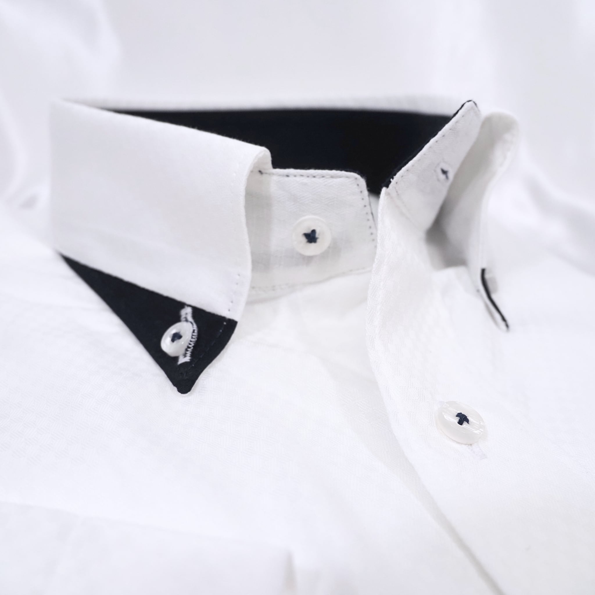 衿裏のネイビー配色が、ノータイスタイルにも映えるアクセントに。