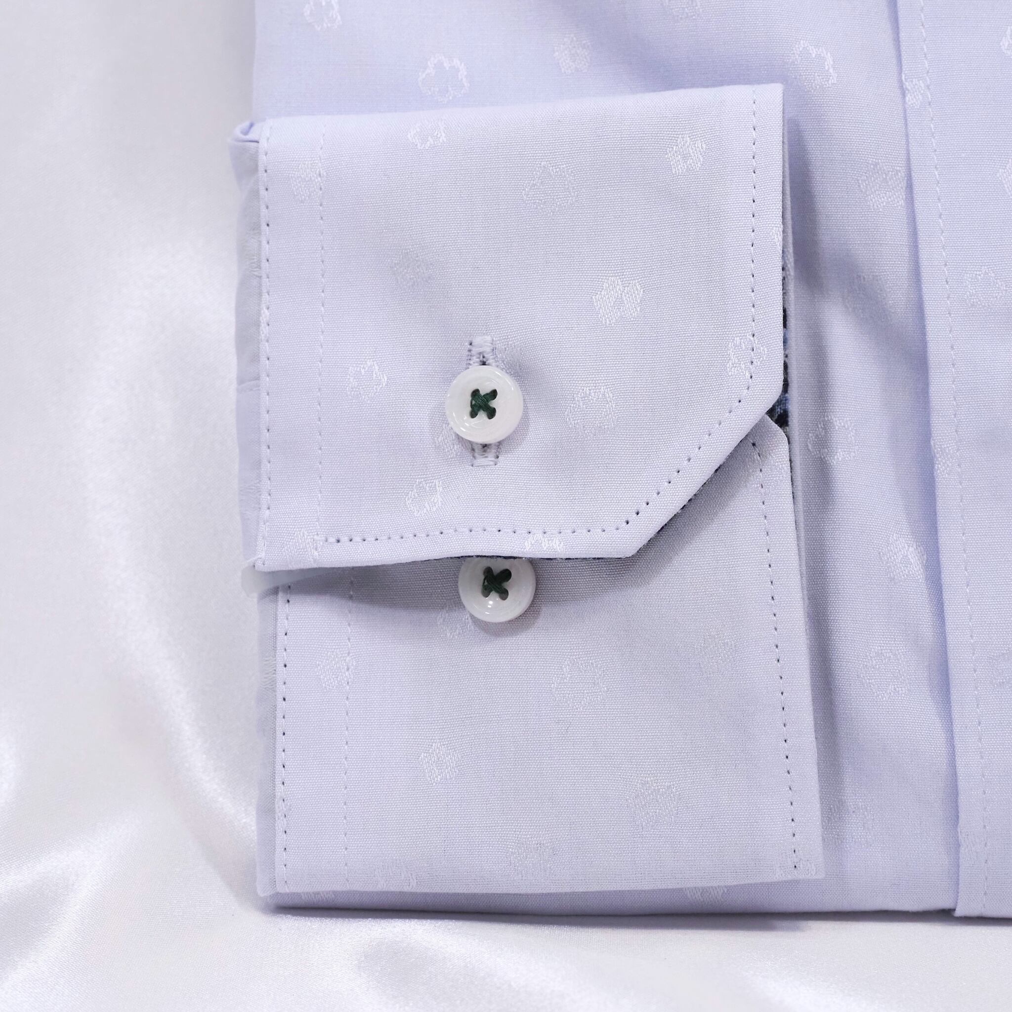 上品な青みがかったパープルに、小花の飛び柄を織り込んだ華やかな長袖シャツ。