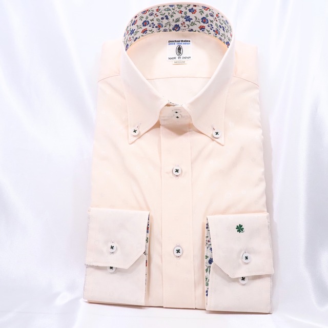 ふんわりと優しい印象の淡いカラーに、小花の飛び柄が織り込まれた上品な長袖シャツ。