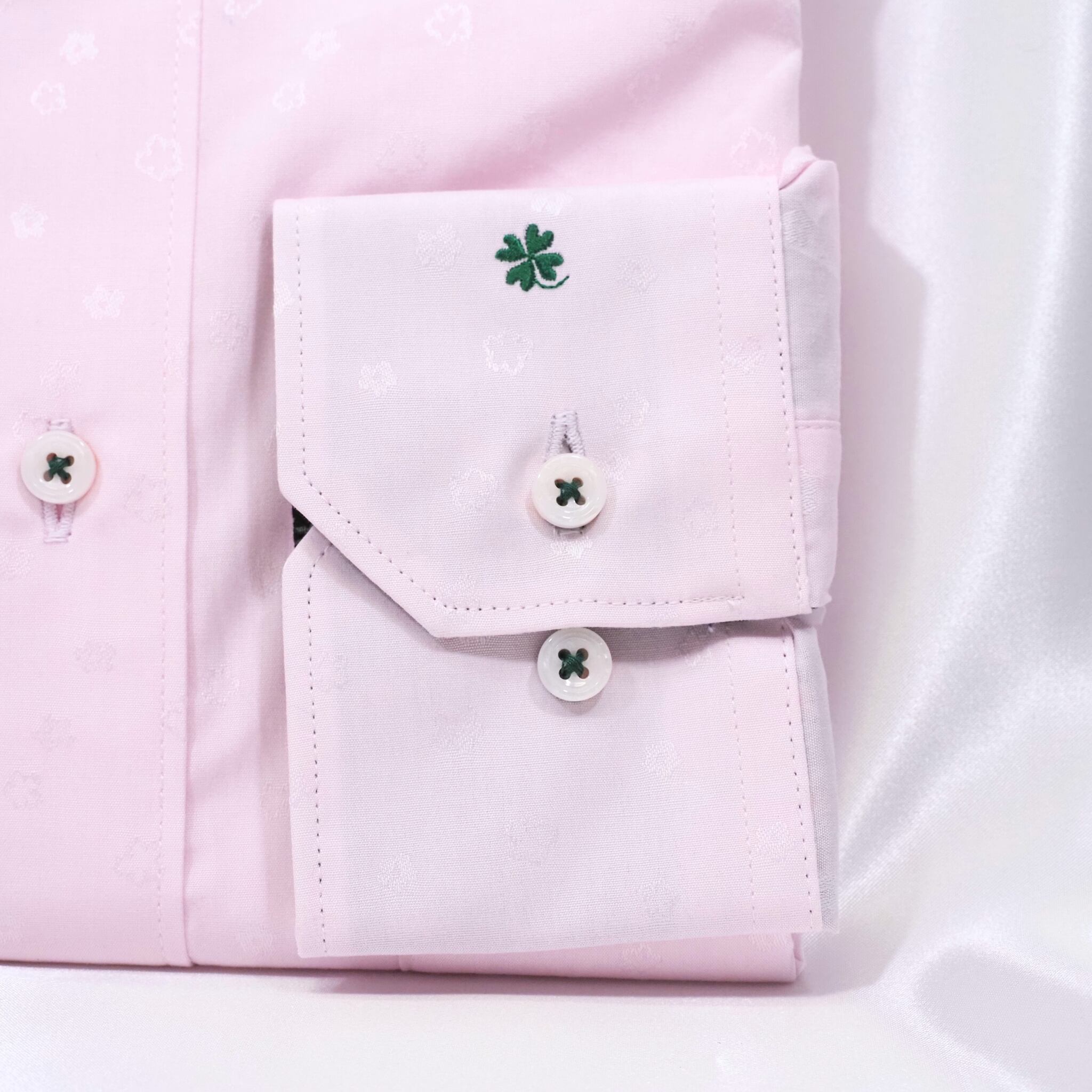 柔らかなピンクの生地に、小さな花模様を織り込んだ愛らしい印象の長袖シャツ。