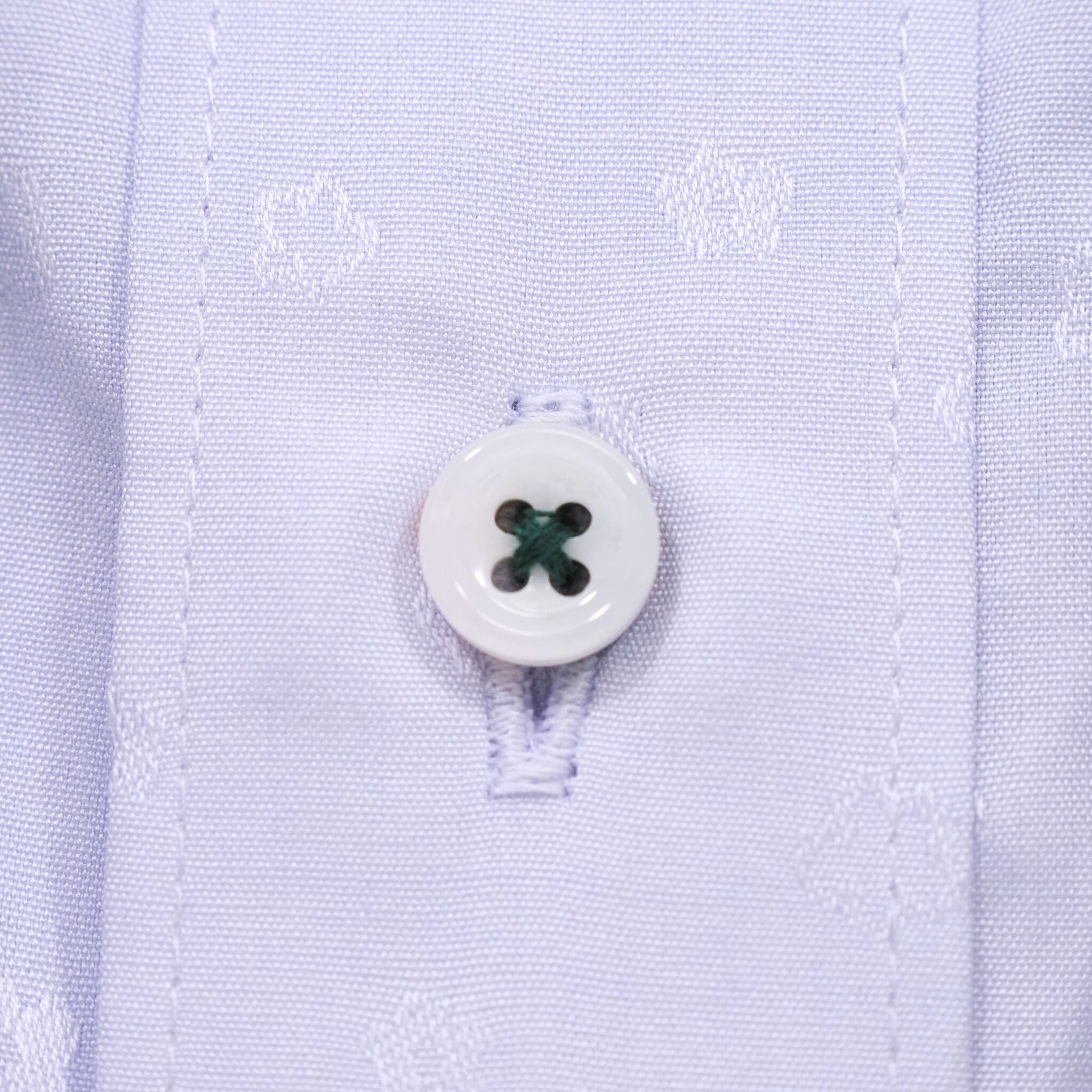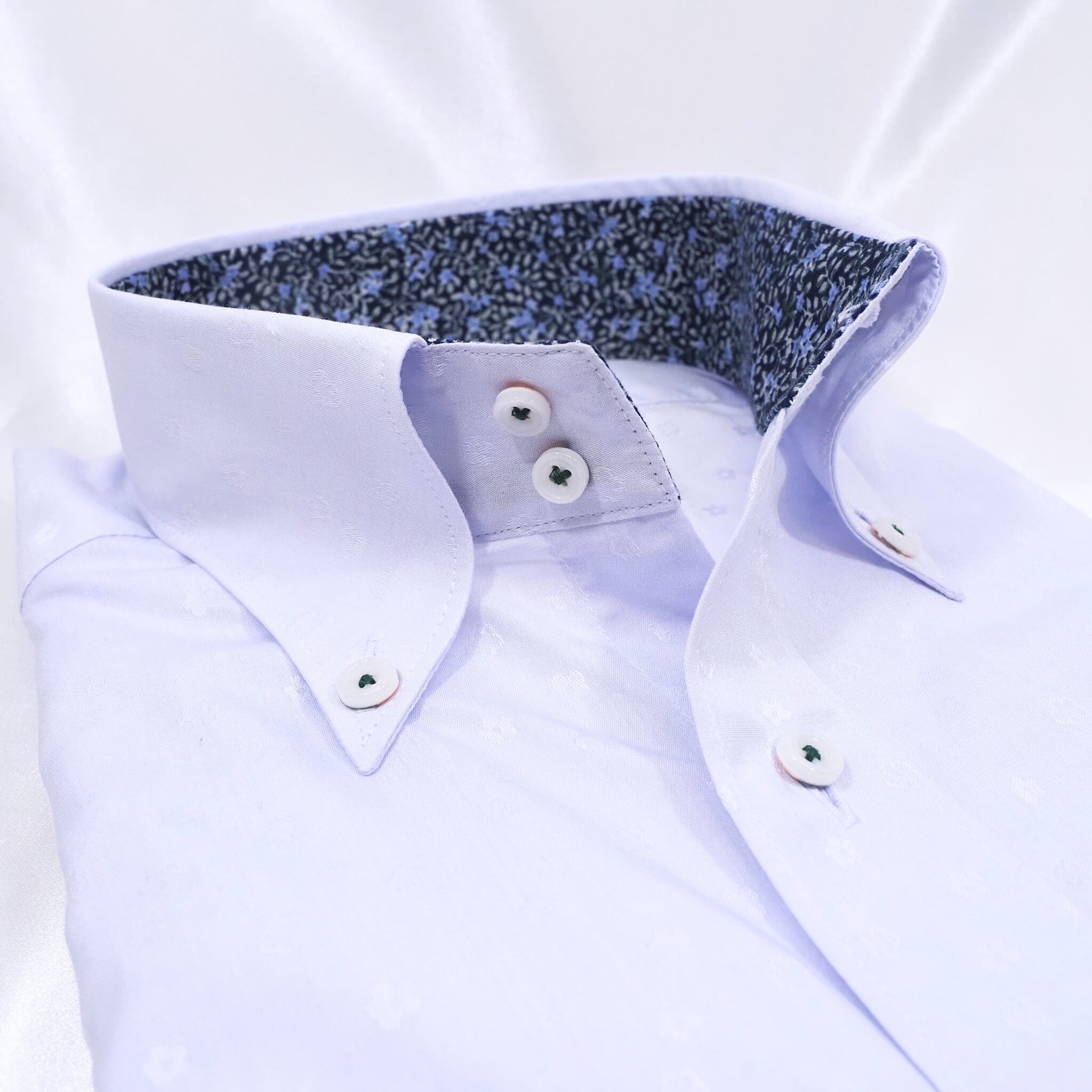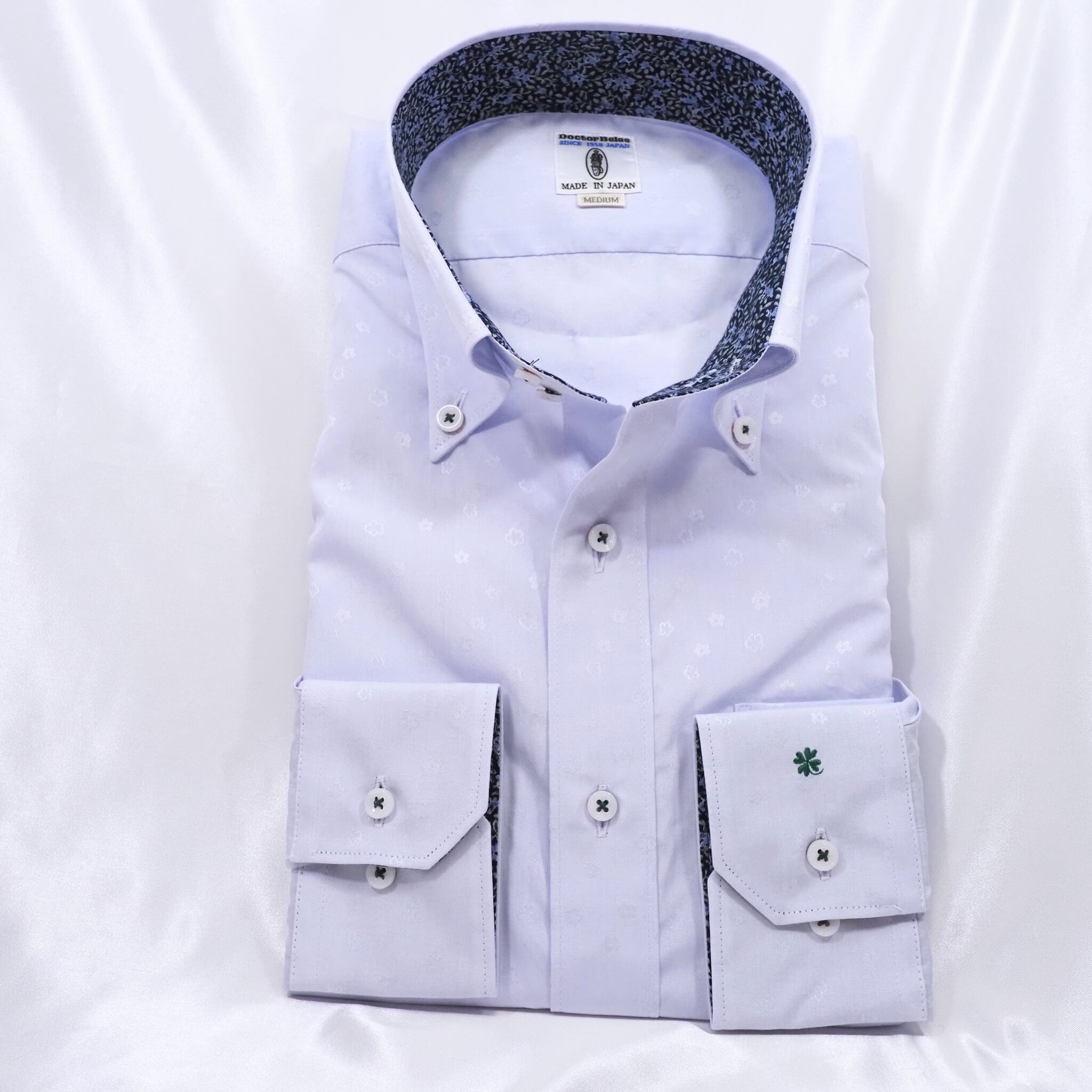 上品な青みがかったパープルに、小花の飛び柄を織り込んだ華やかな長袖シャツ。