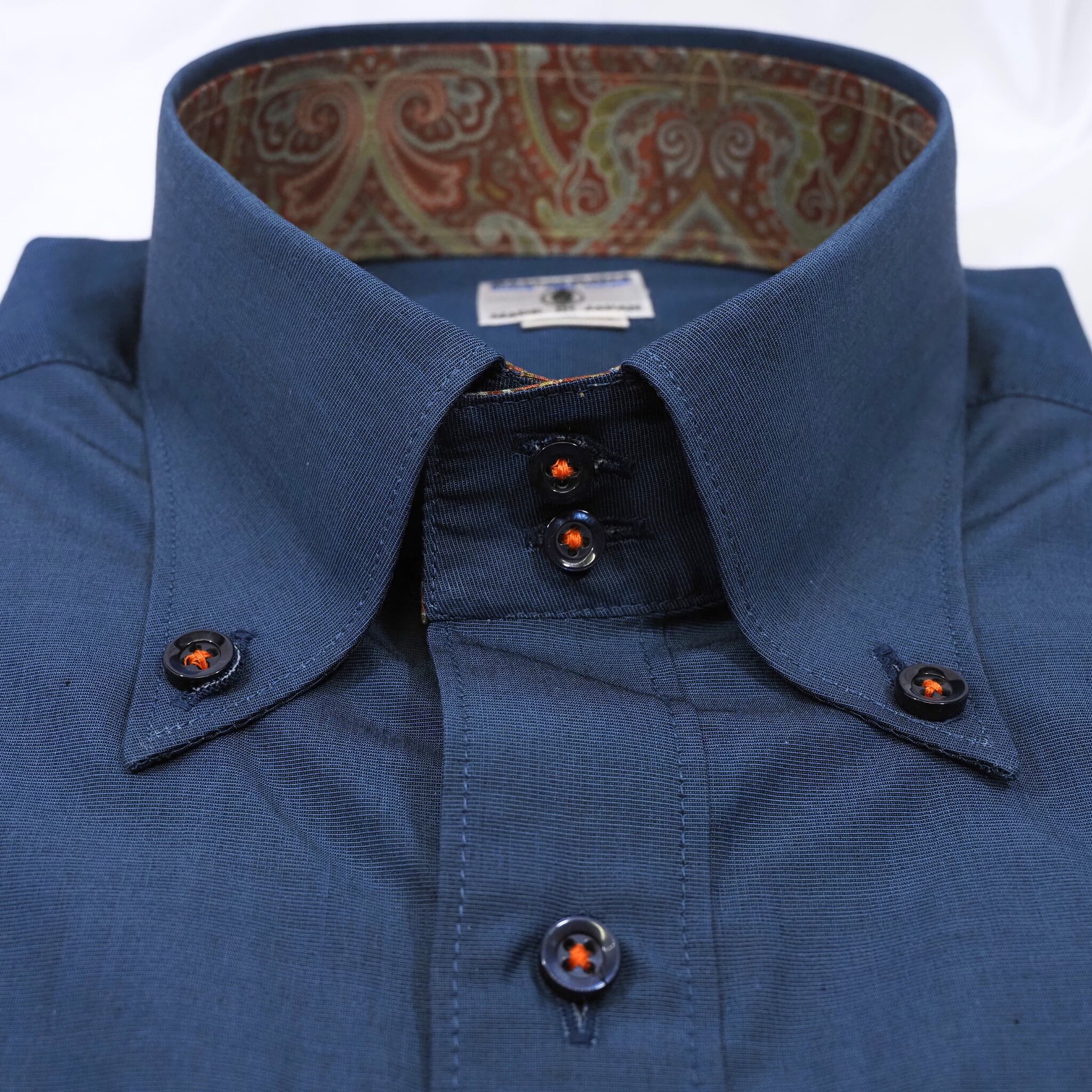 深みのあるブルーに、袖口・衿裏のペイズリー柄が華やかさを添える一枚。