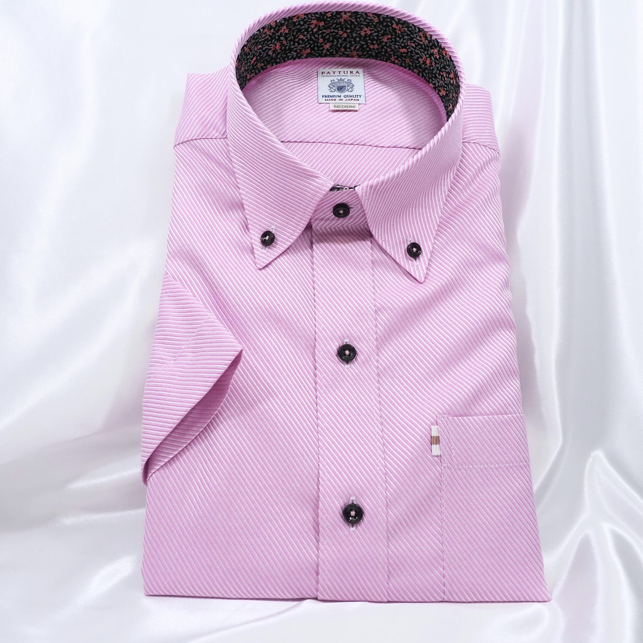 華やかなピンクのストライプが目を引く、夏らしい半袖シャツ。