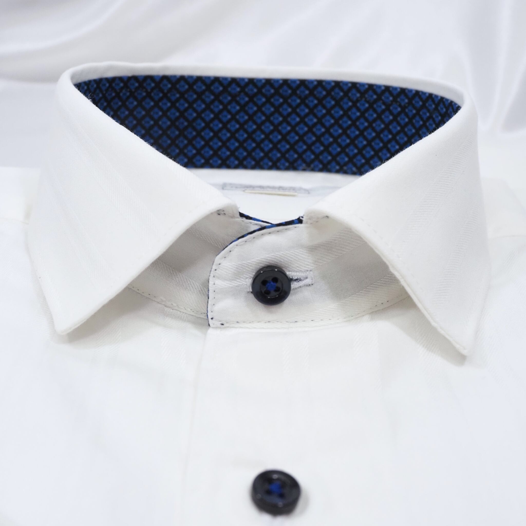 光の加減でさりげなく浮かび上がる織り柄が美しい白の半袖シャツ。