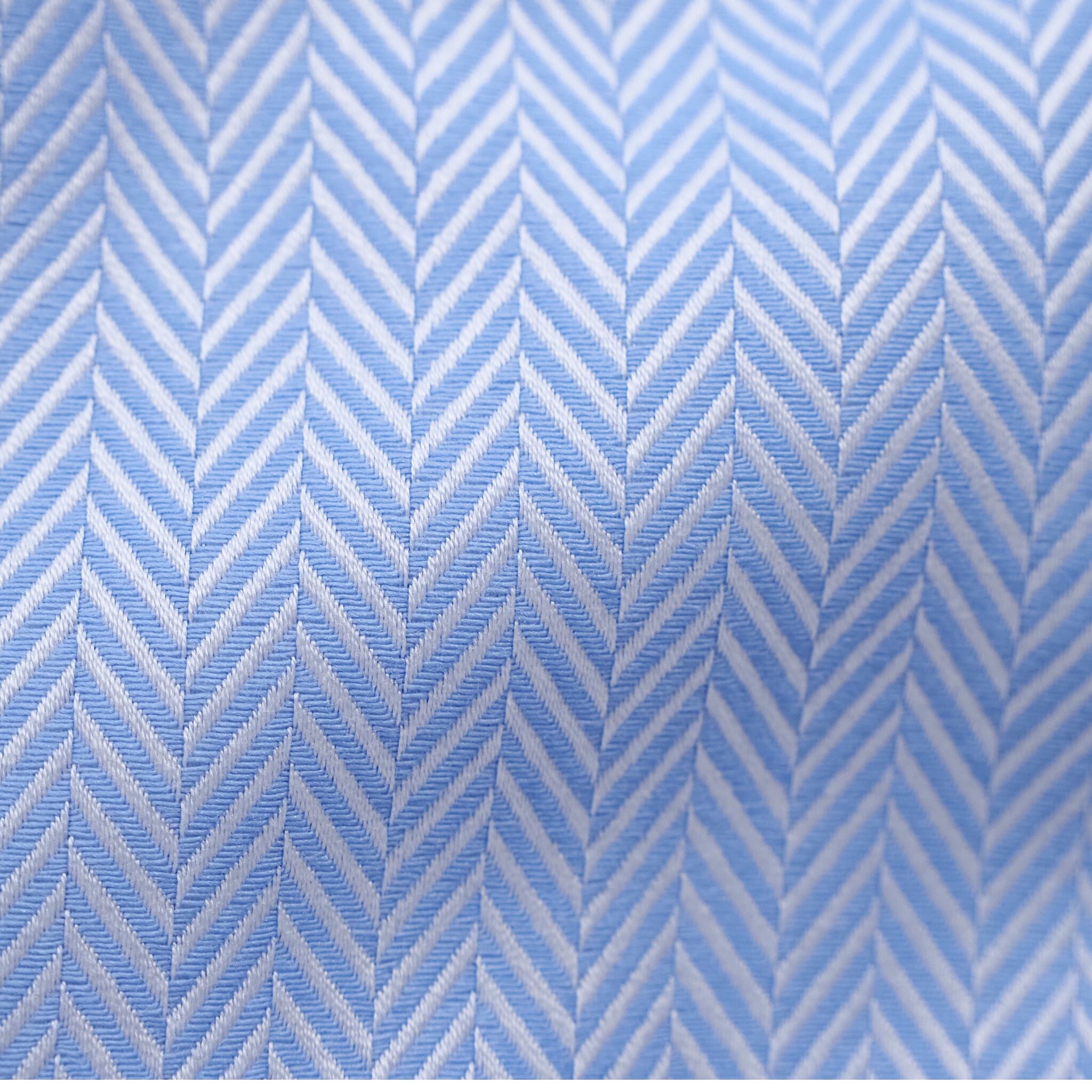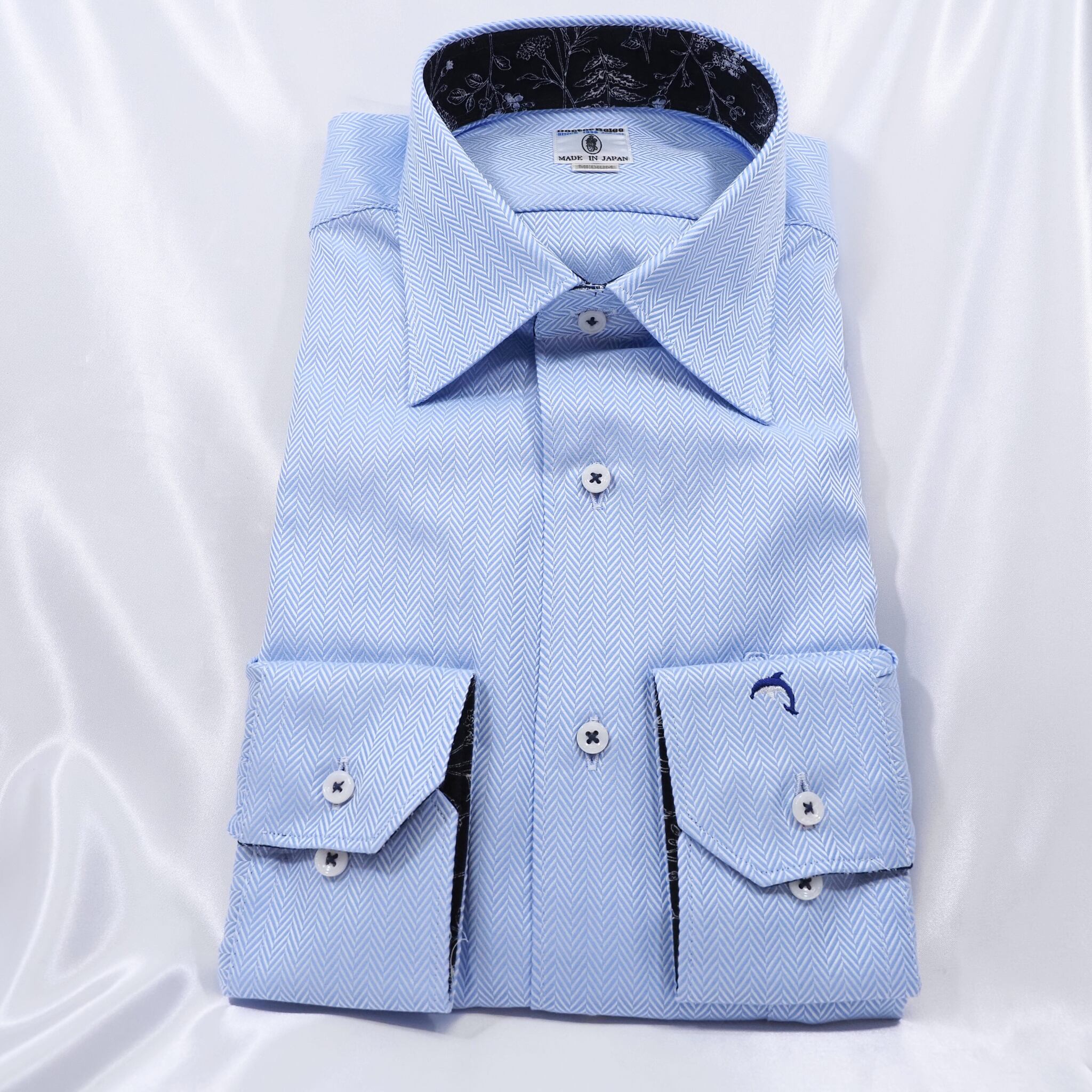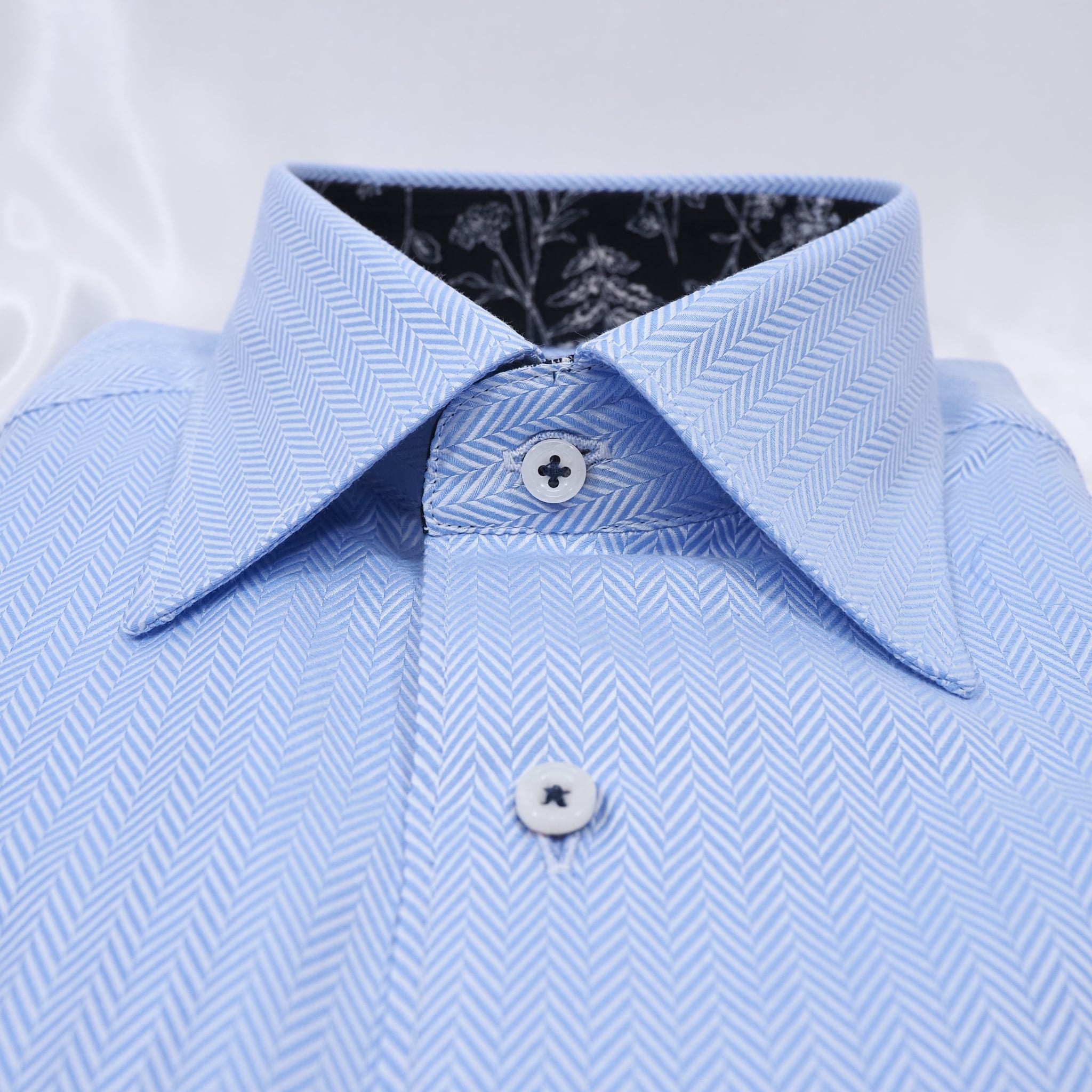 爽やかなブルーのヘリンボーン柄に、衿裏とカフス裏へ紺地のフラワー柄を合わせた長袖シャツ。