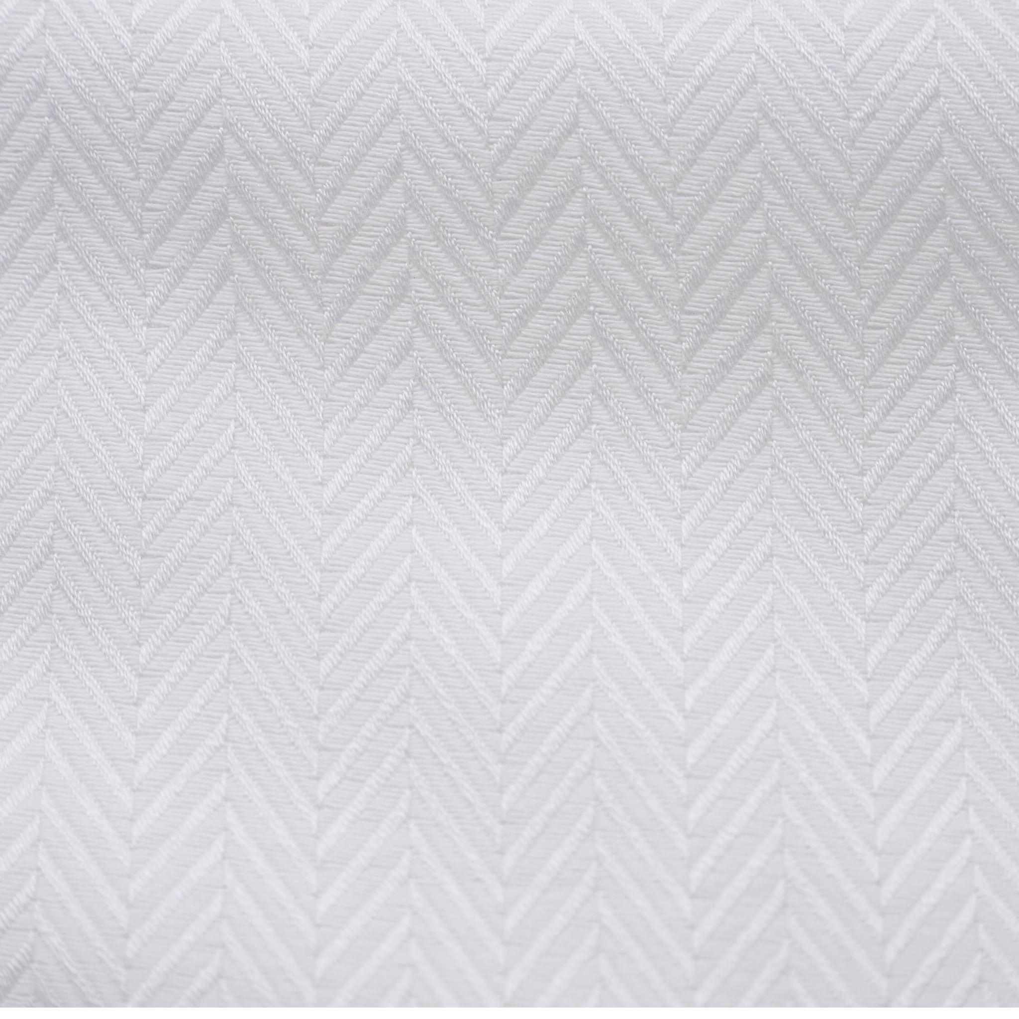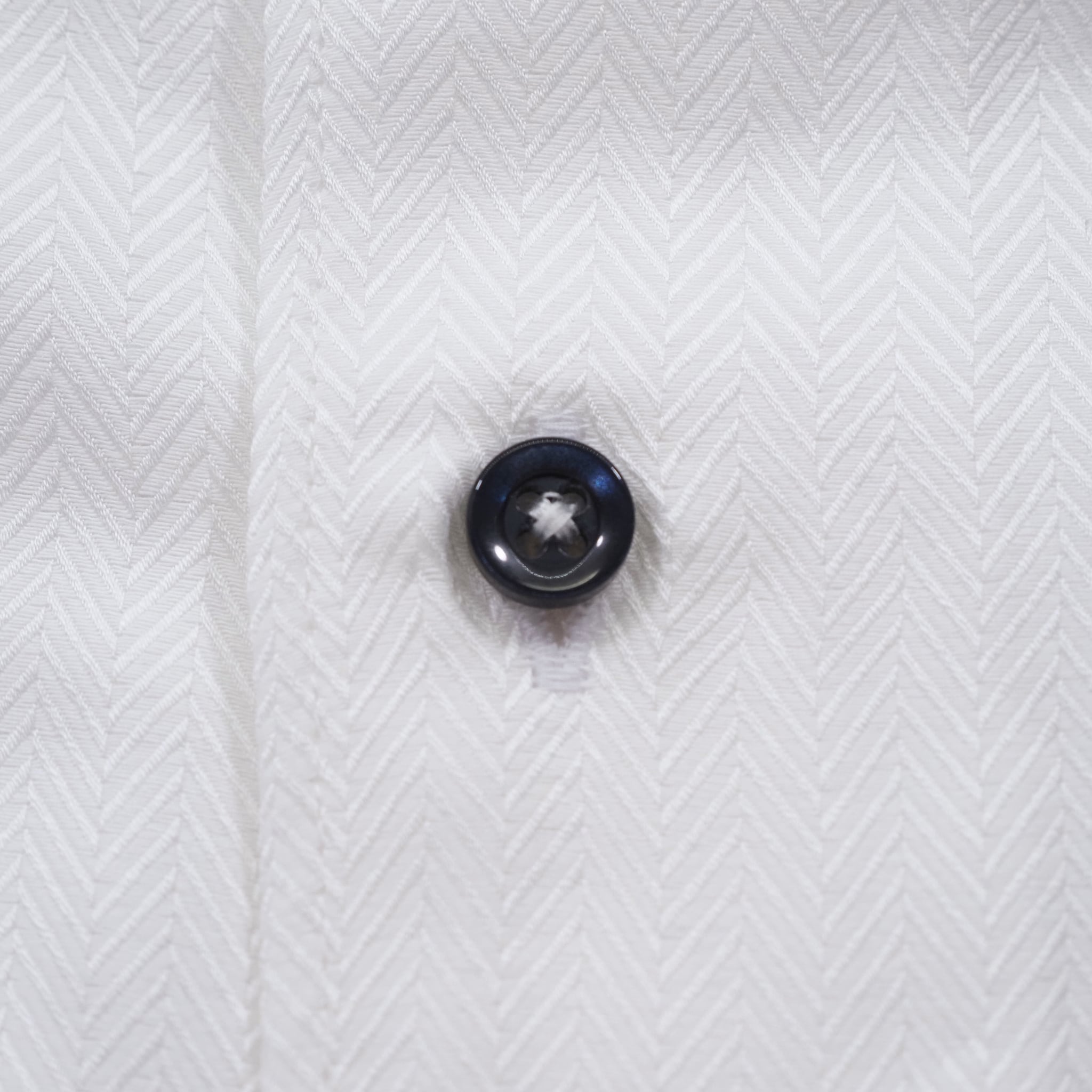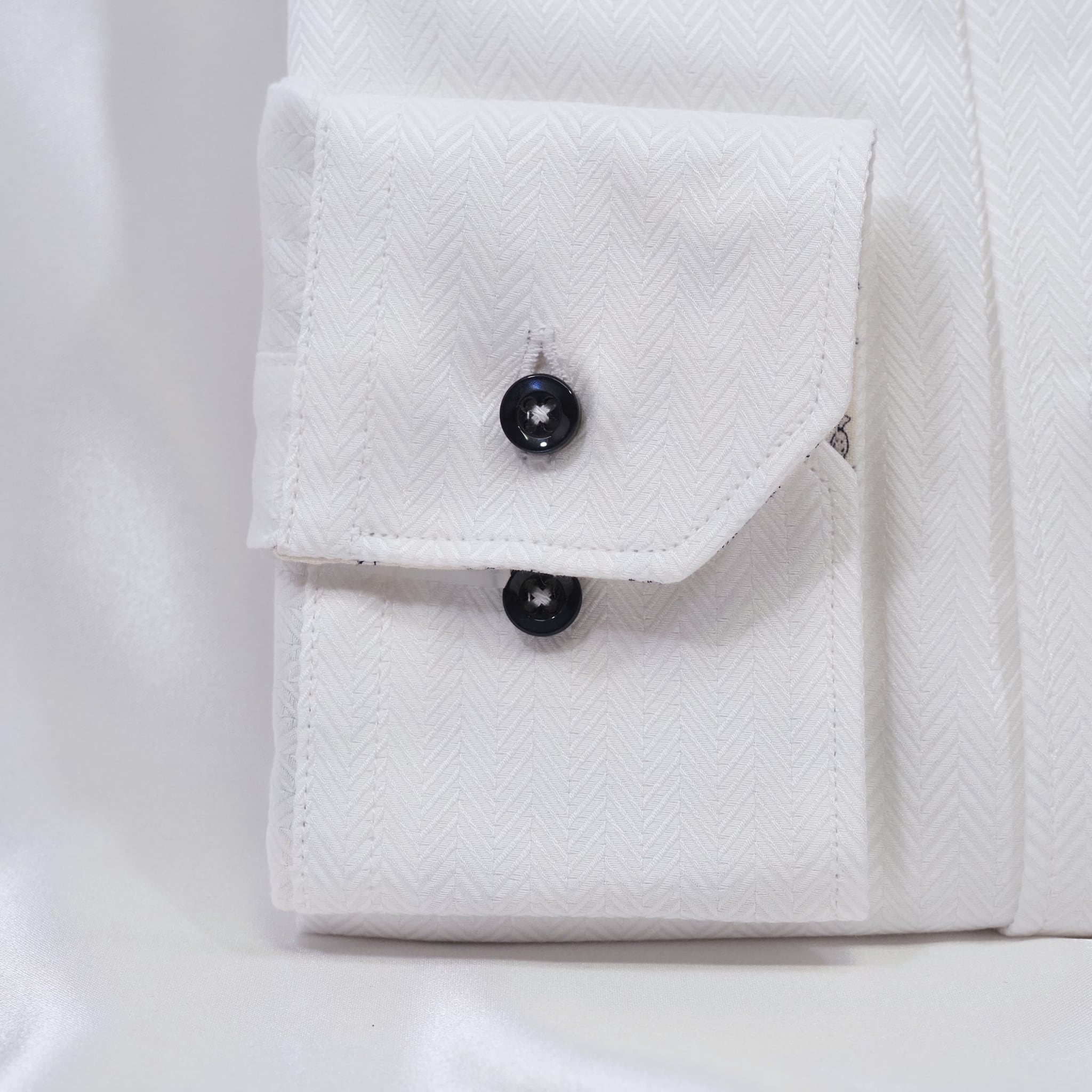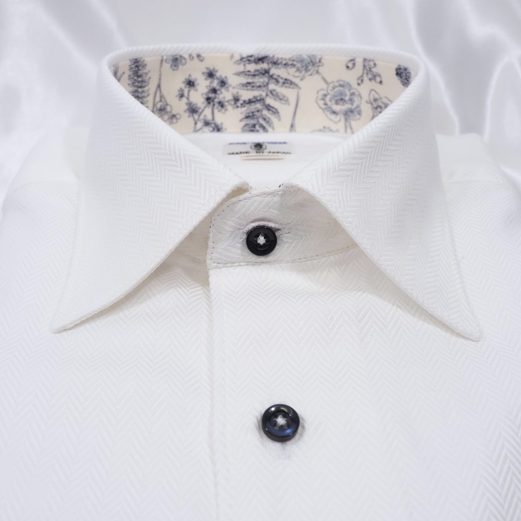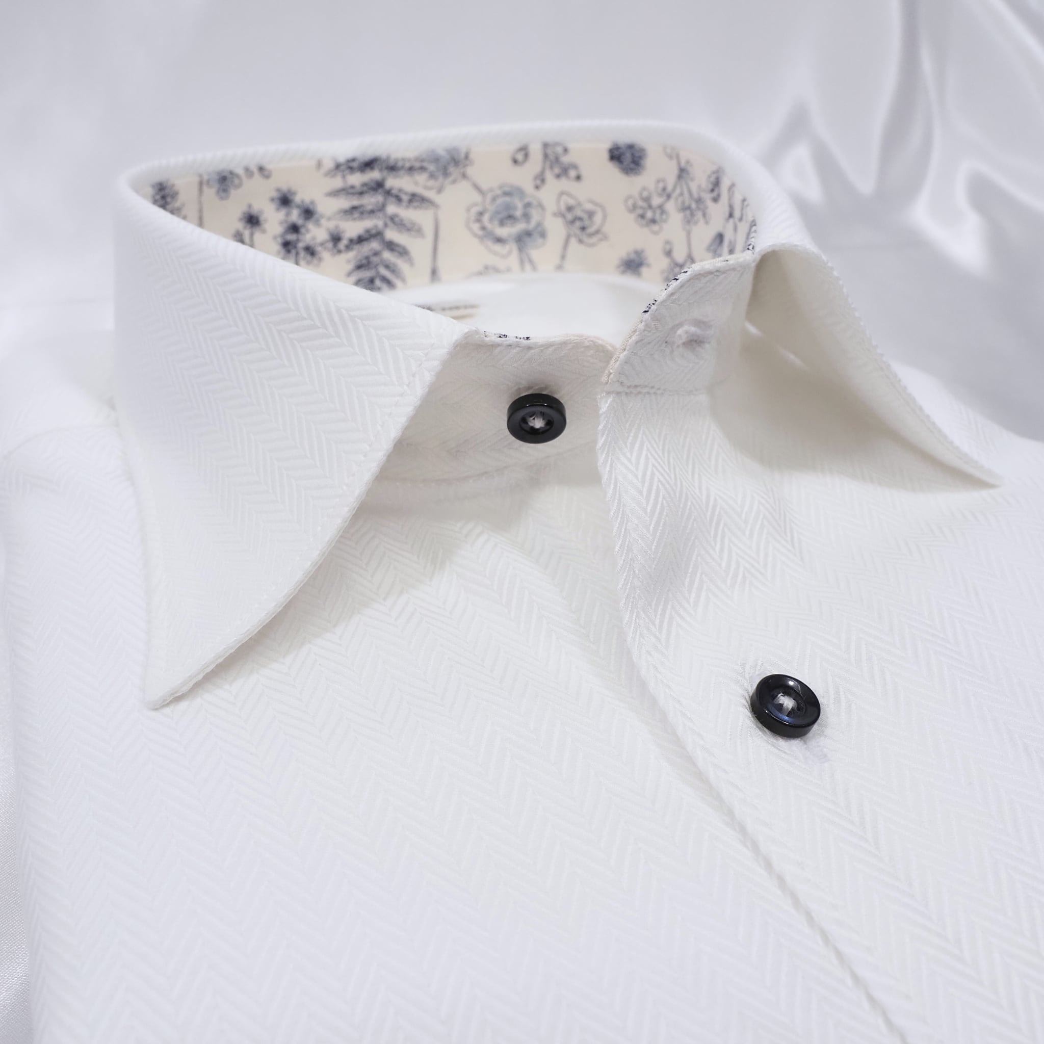 白のヘリンボーン生地に、衿裏とカフス裏へフラワー柄を合わせた長袖シャツ。