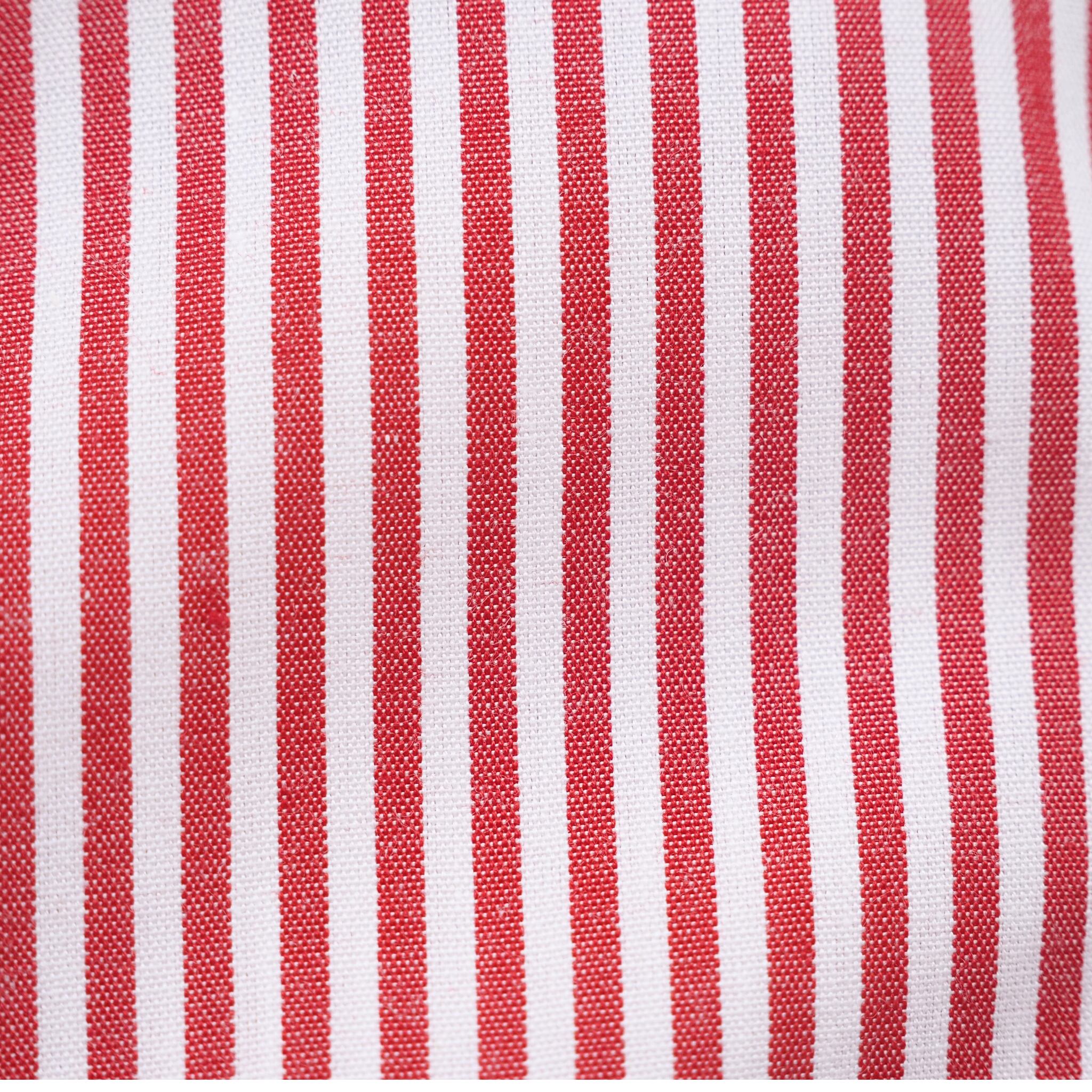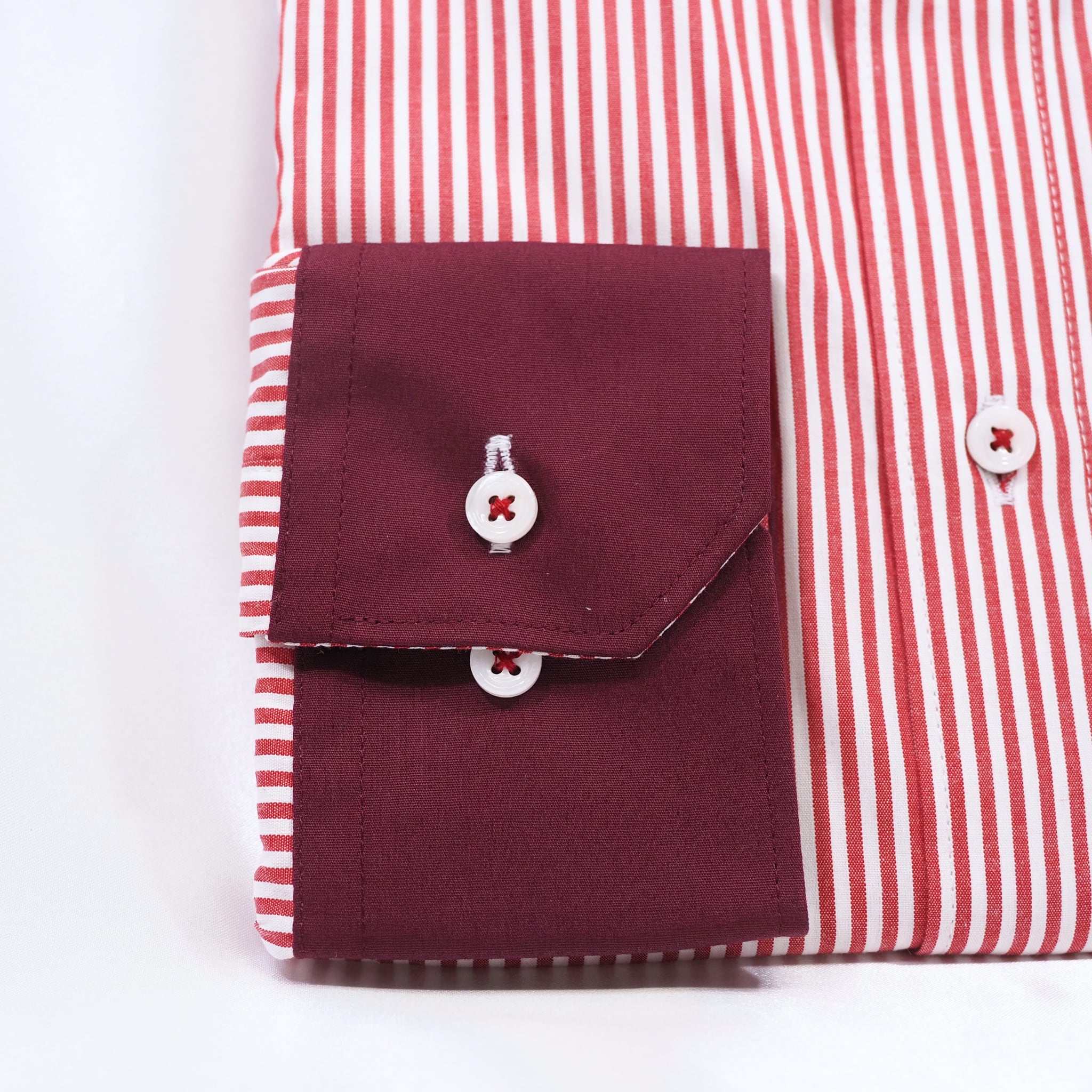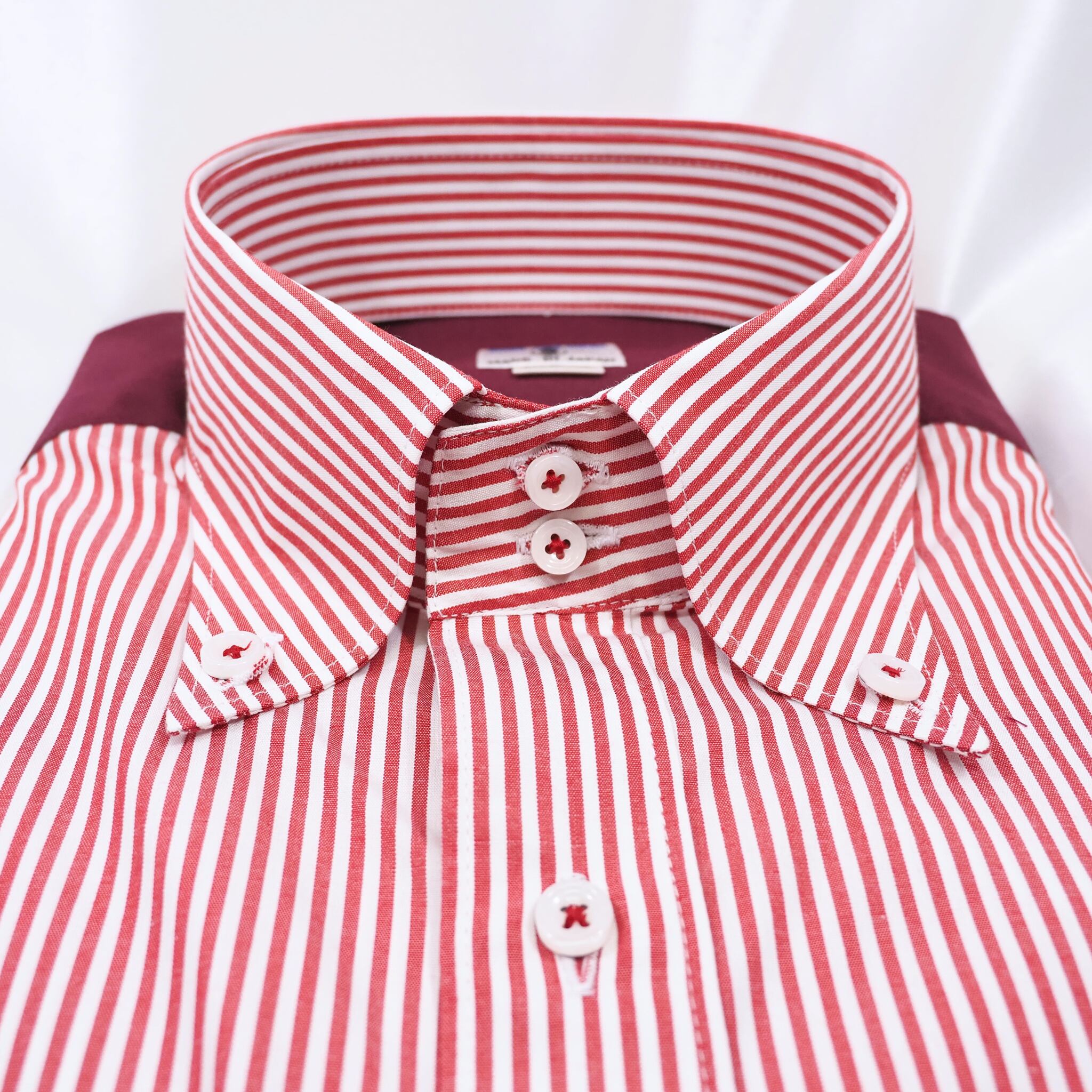 エンジと白のストライプに、ヨーク・ポケット・カフスへエンジ生地を切り替えた長袖シャツ。