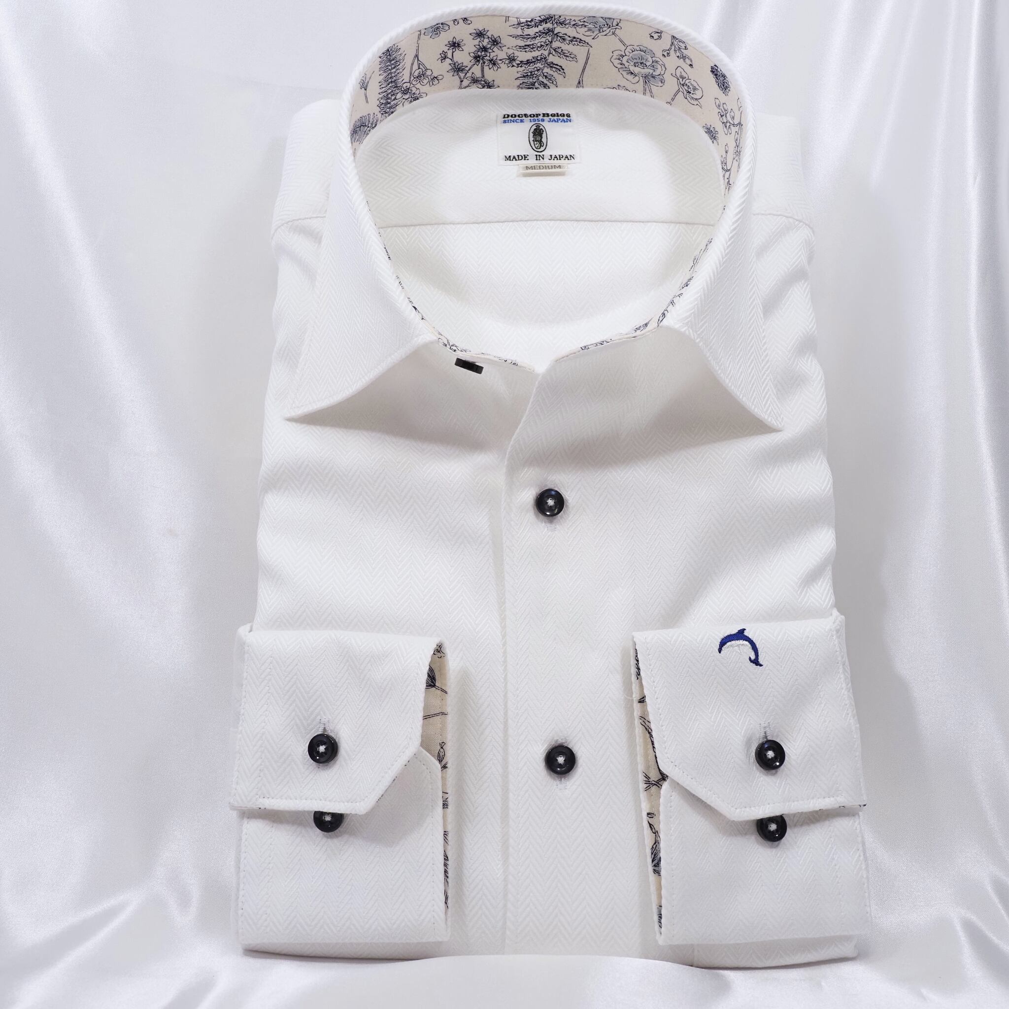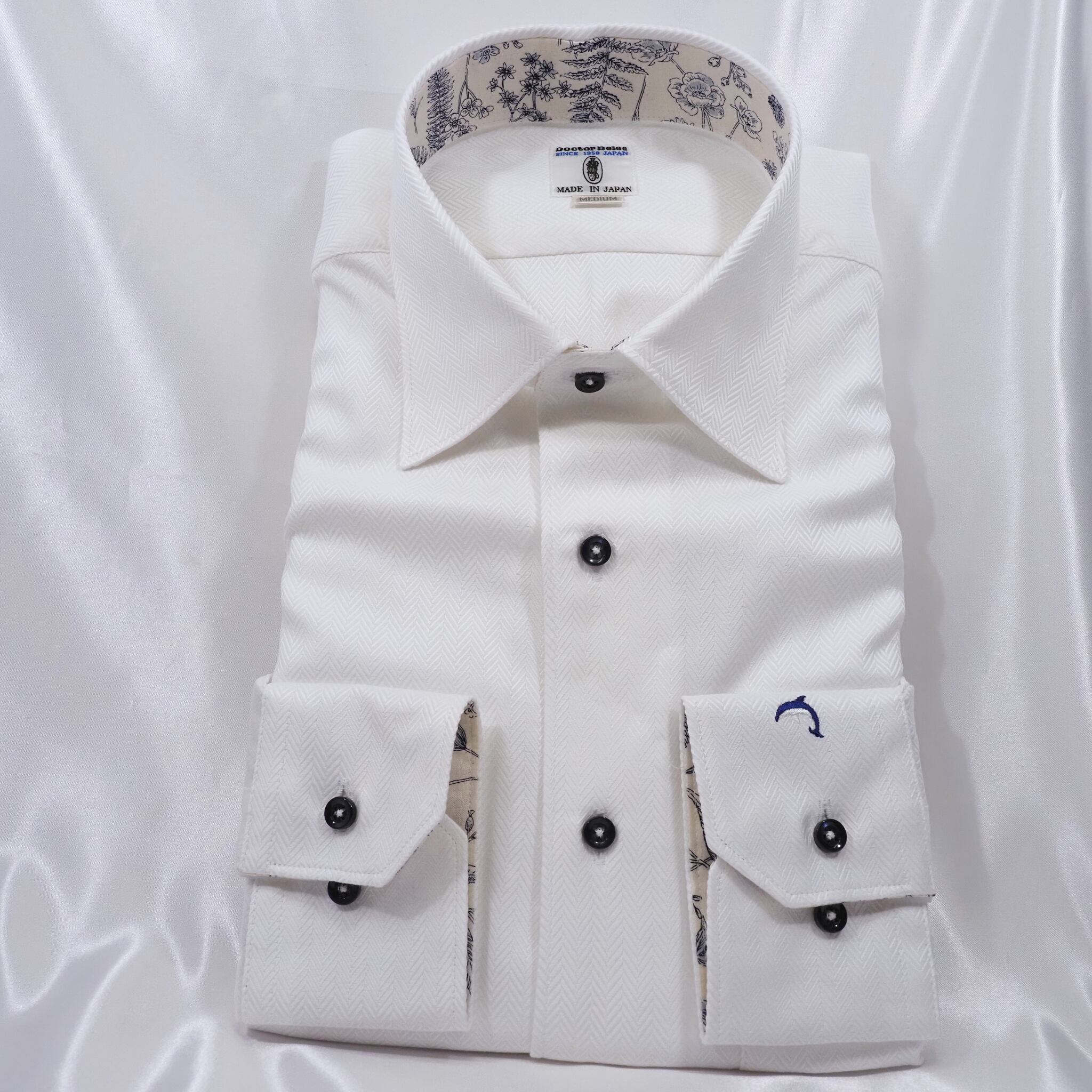 白のヘリンボーン生地に、衿裏とカフス裏へフラワー柄を合わせた長袖シャツ。