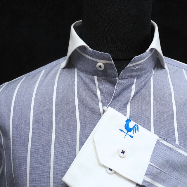 ブルー地にホワイトのストライプを配し、衿とカフスを白で切り替えた爽やかな長袖シャツ。
