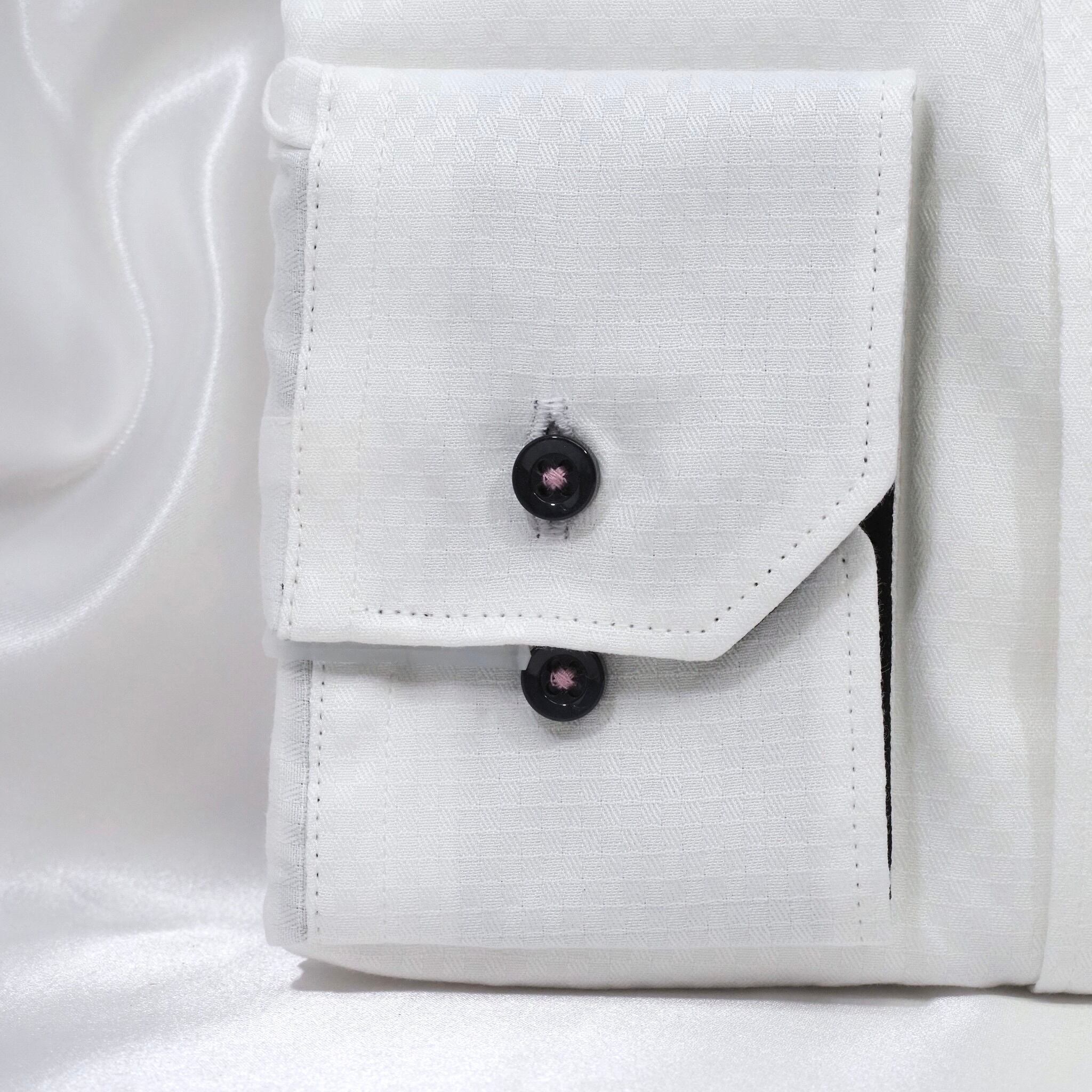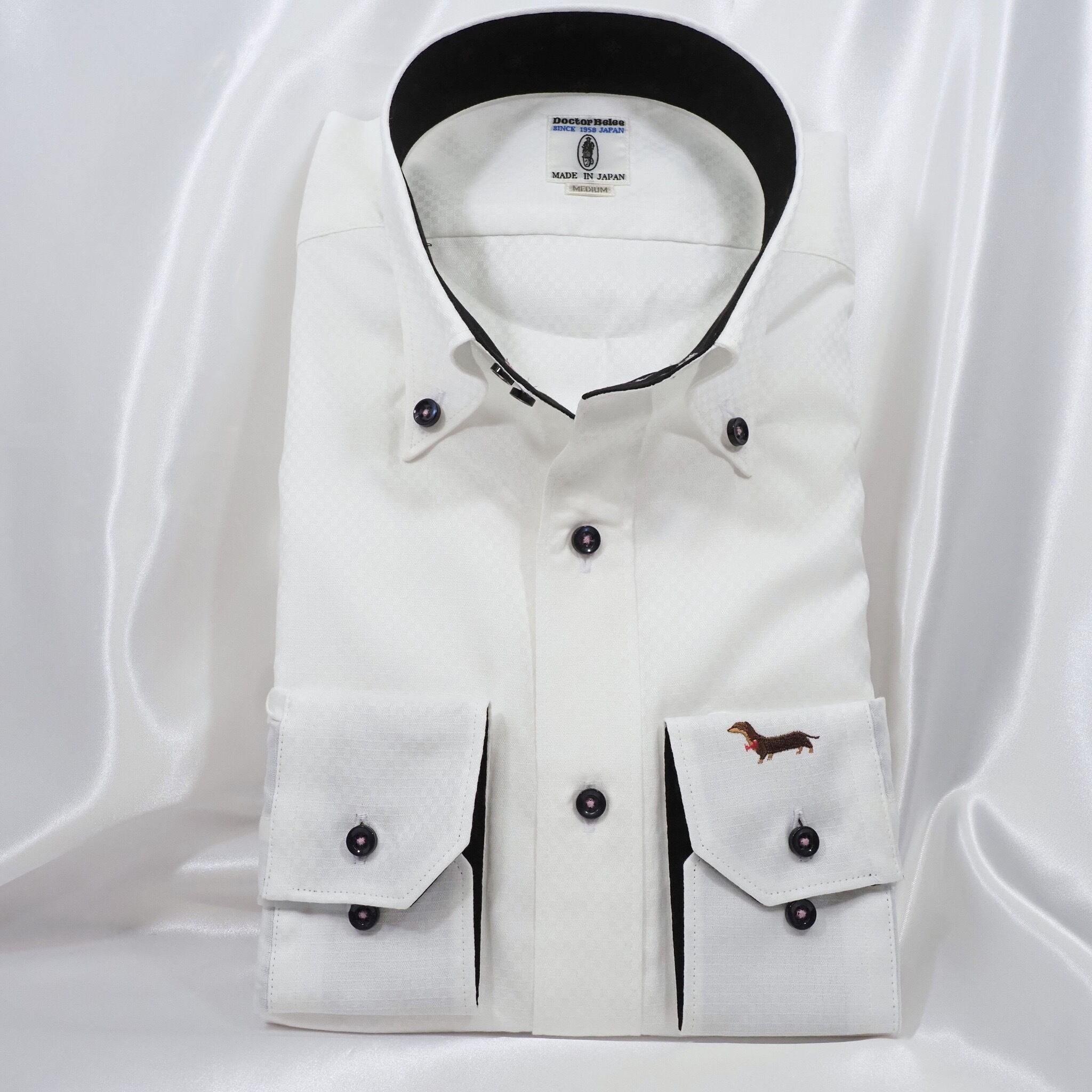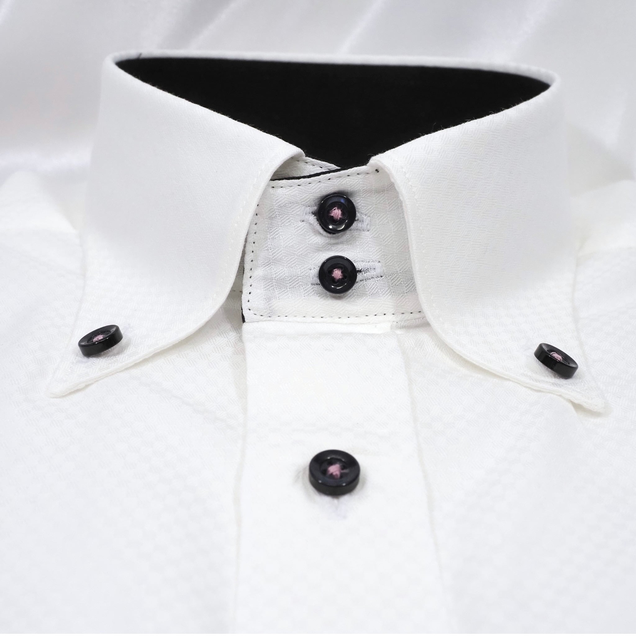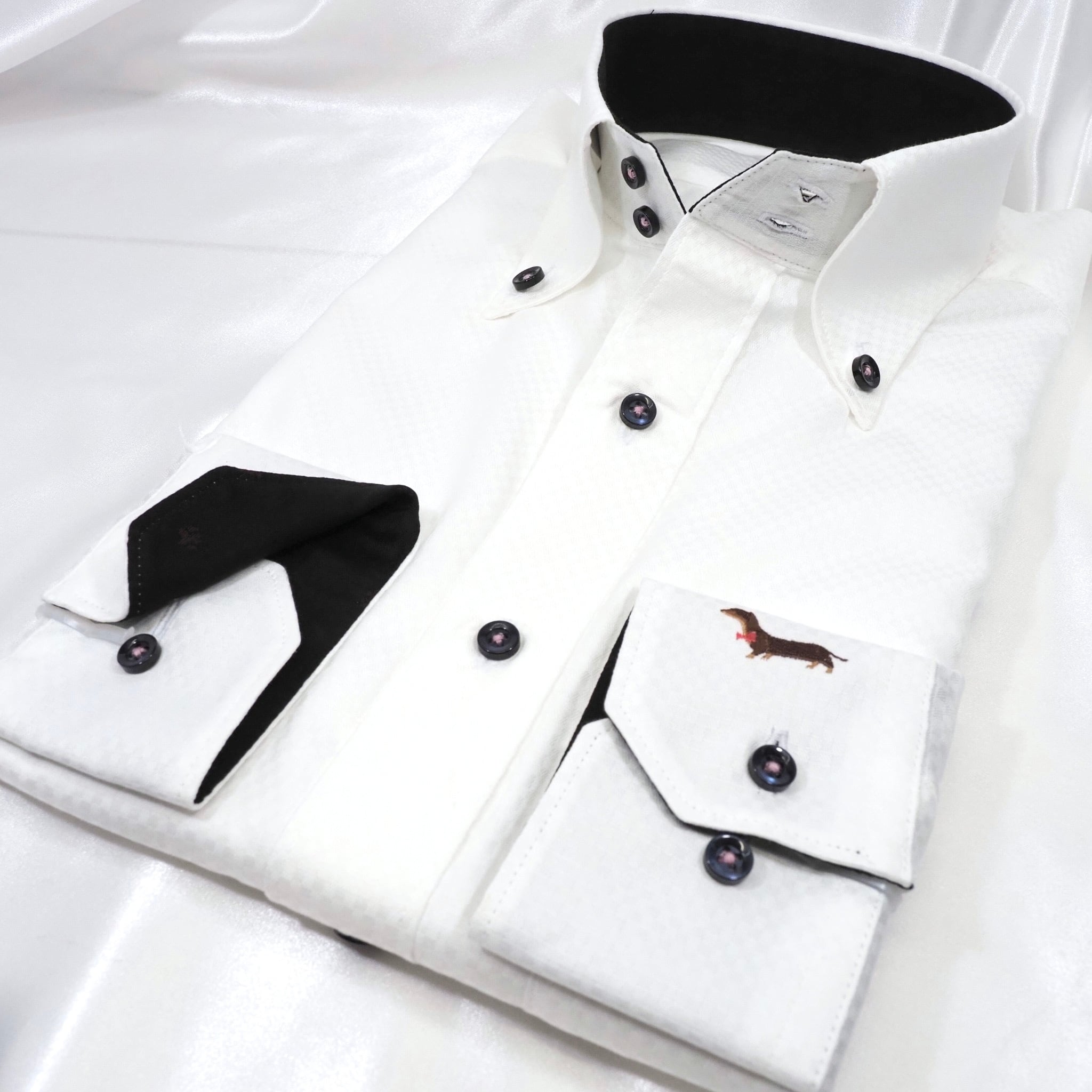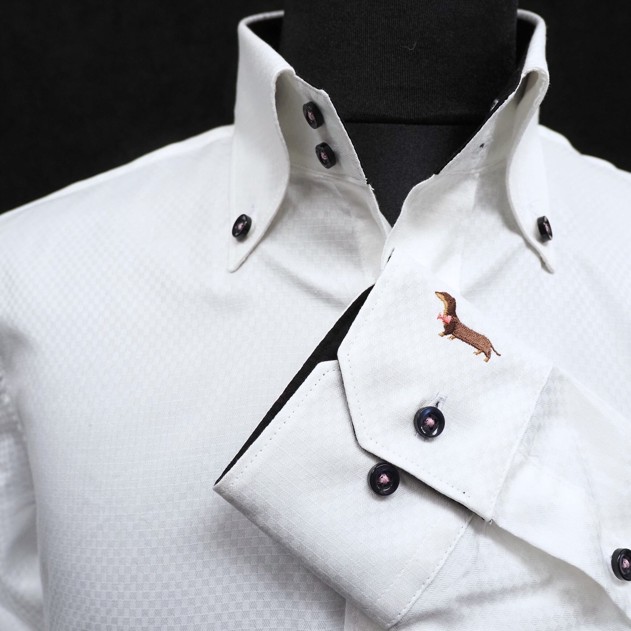 立体感のある白地に、エンジの衿裏・カフス裏で引き締めたクラシックな一枚。