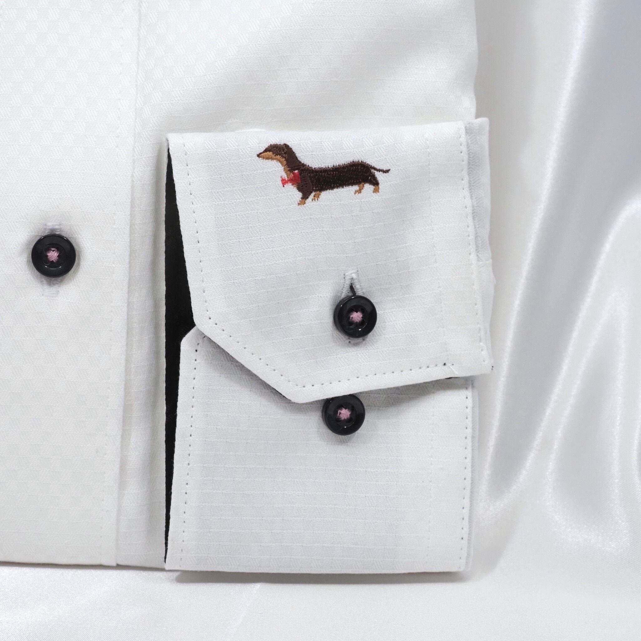 左袖の“蝶ネクタイを締めたダックスフンド刺繍”が、愛らしさを添えます。