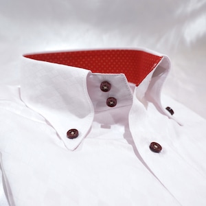 襟裏やカフス裏の赤に金ドットがさりげなく覗き、ノーネクタイでも映えます。