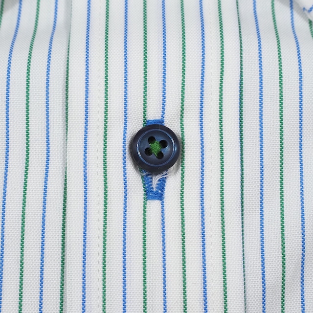白地にブルーとグリーンの細ラインを重ねた、王道の爽やかストライプ。