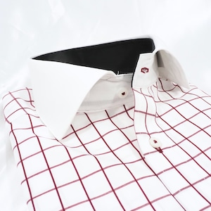 白地にボルドーの格子を乗せた、クラシックで端正な印象のデザイン。