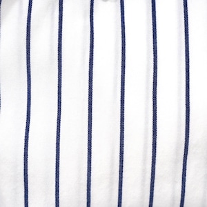 合わせやすい細めでインパクトもある紺ストライプ生地と、紺地に小紋ペイズリーの衿裏・カフス裏が特徴。