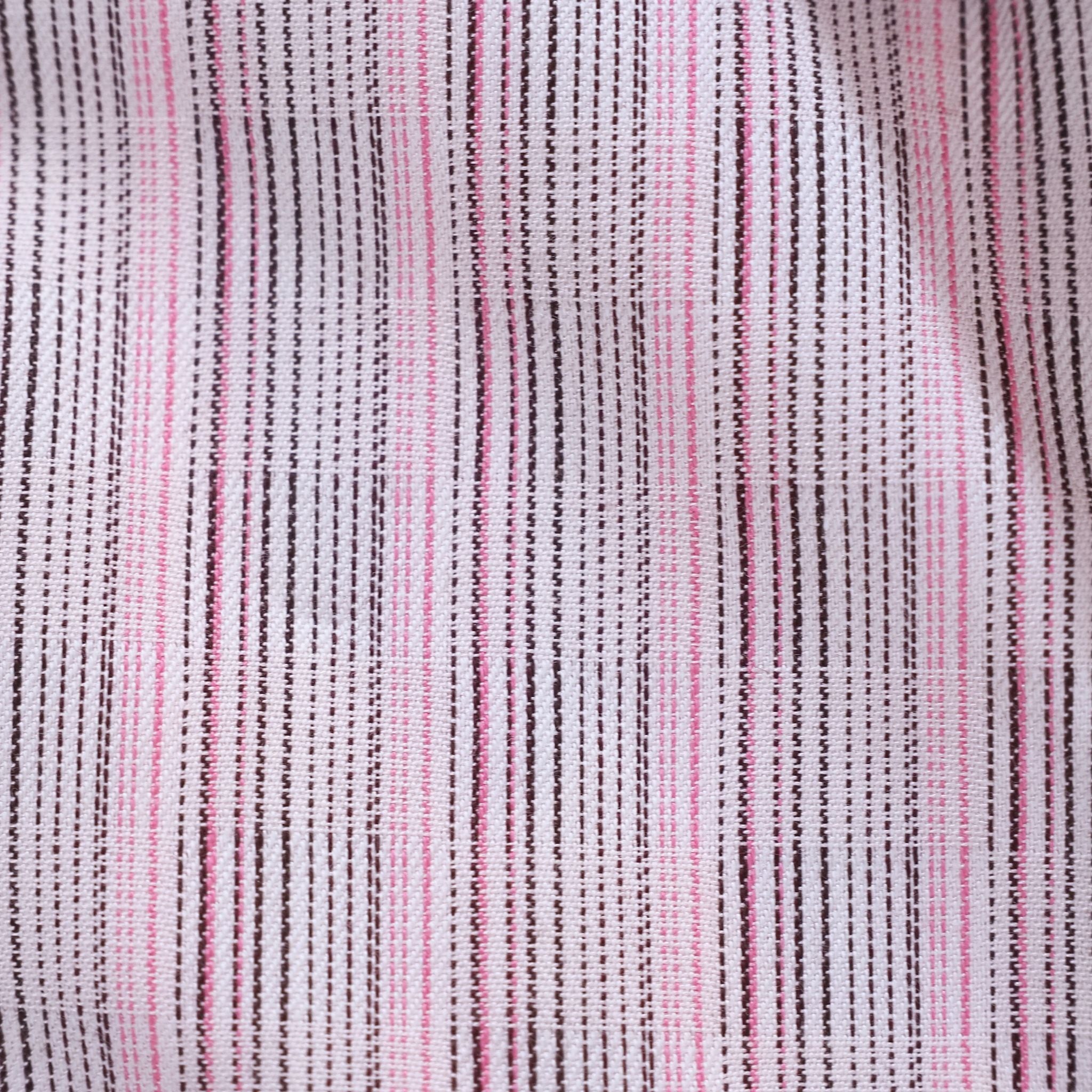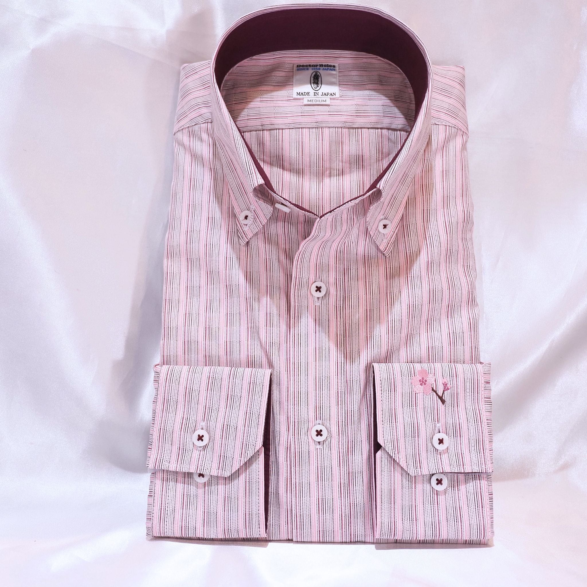 柔らかなピンクストライプに、新たにデビューした桜刺繍が優しく映えるシャツ。