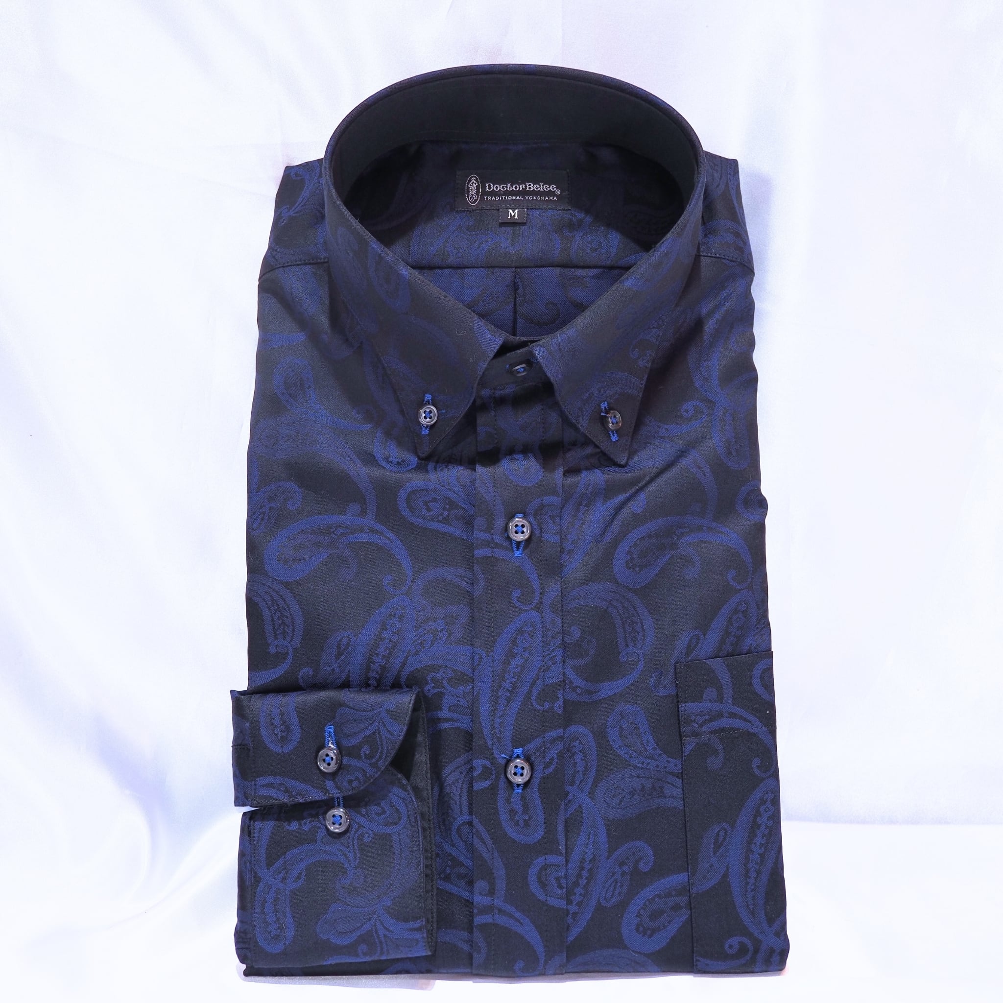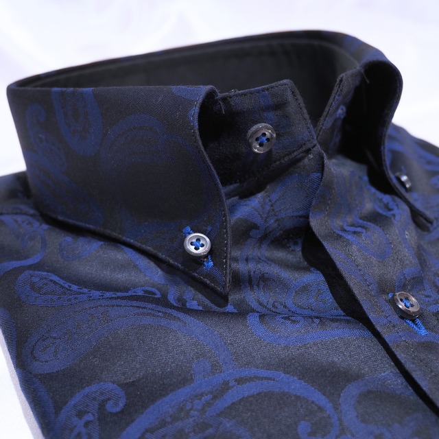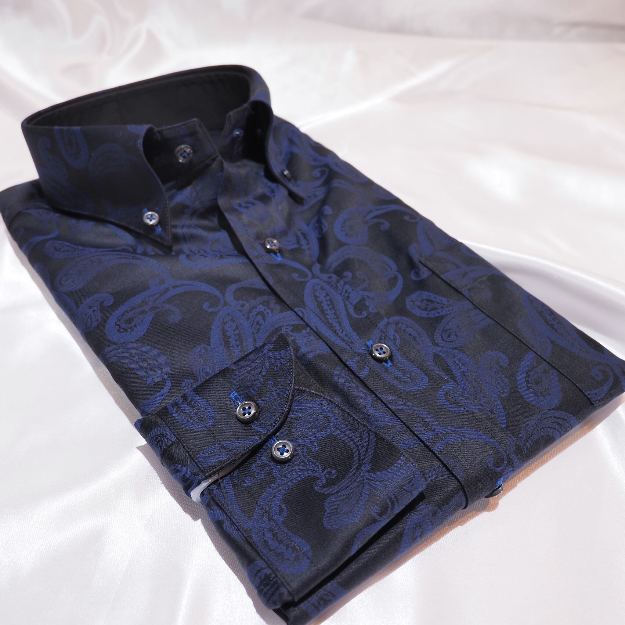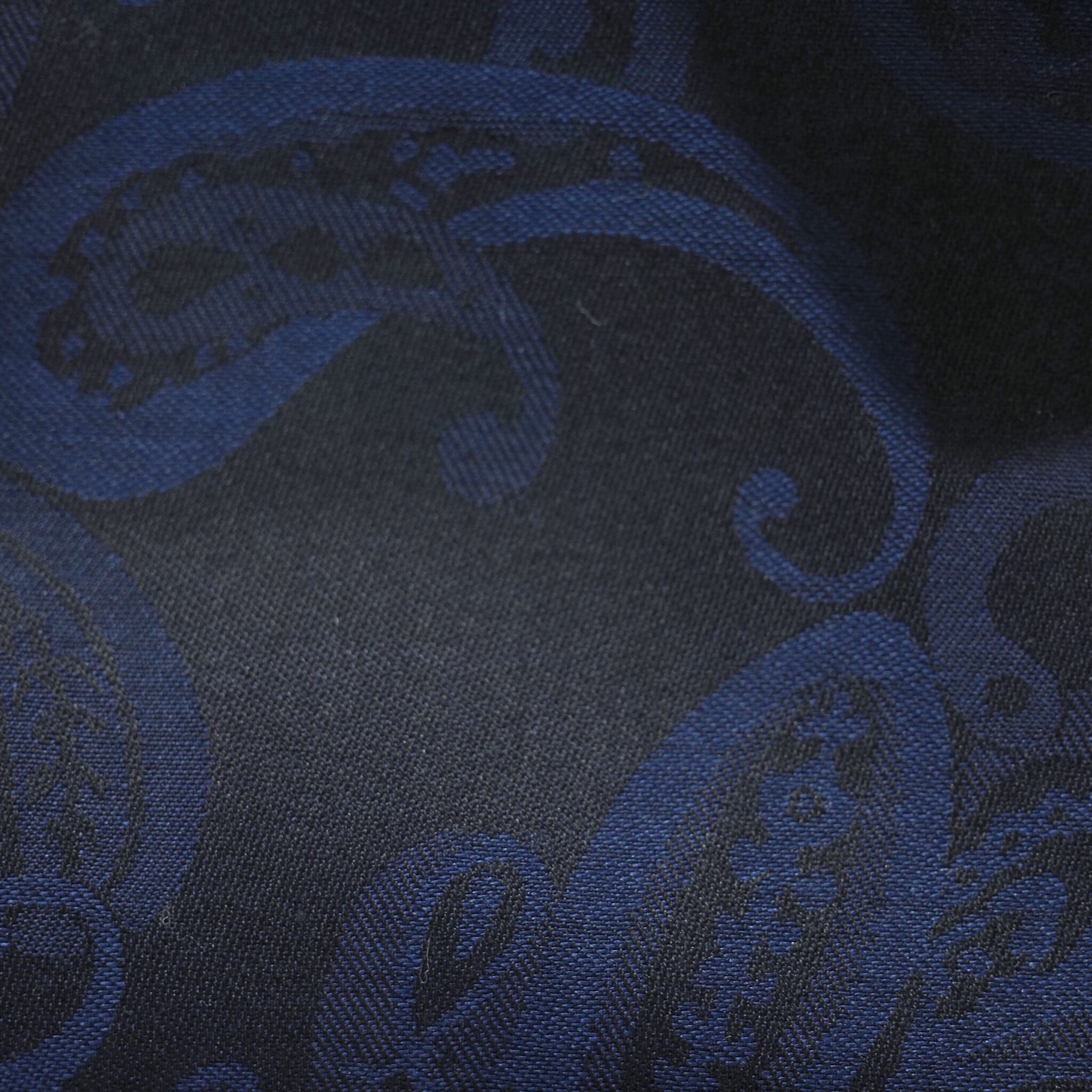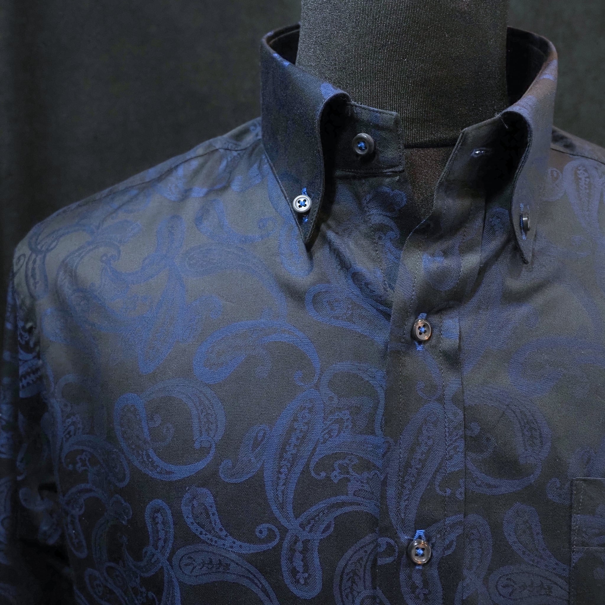 黒ベースの生地に、ブルーの織りで表現したペイズリー柄が映える一着。