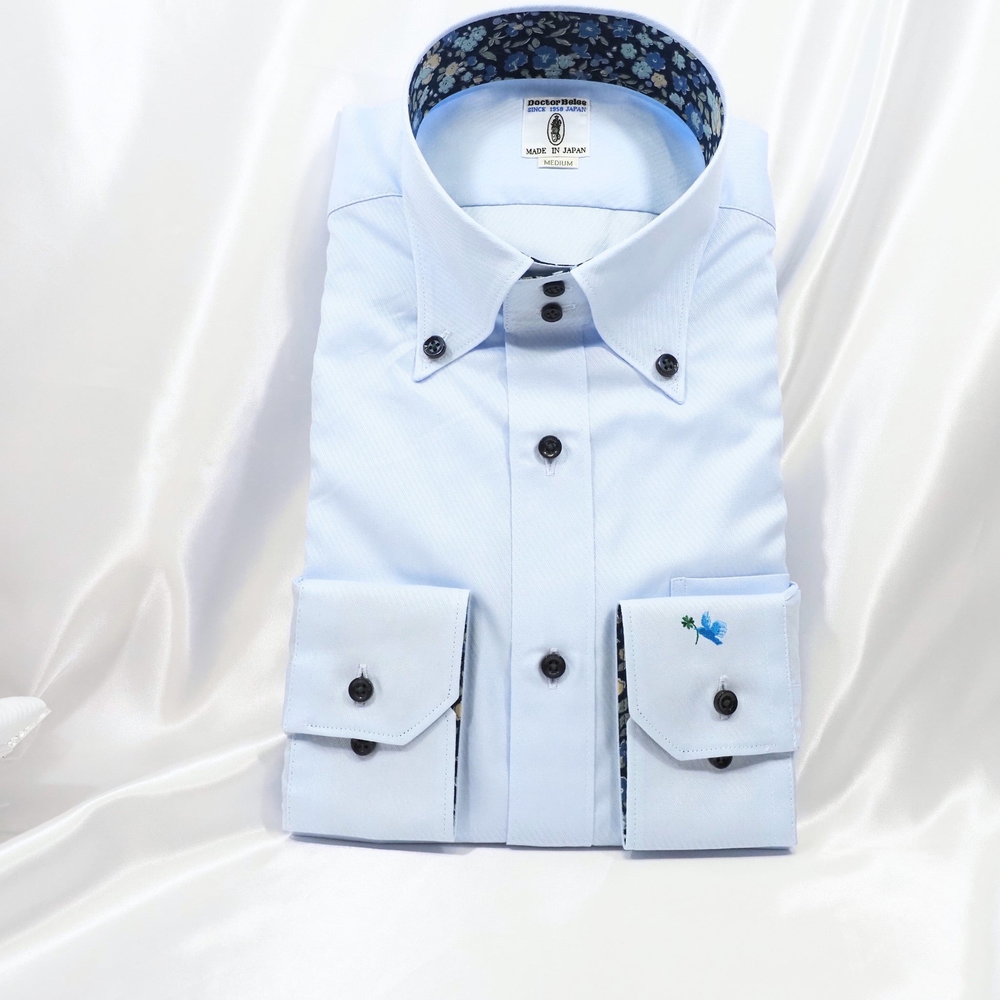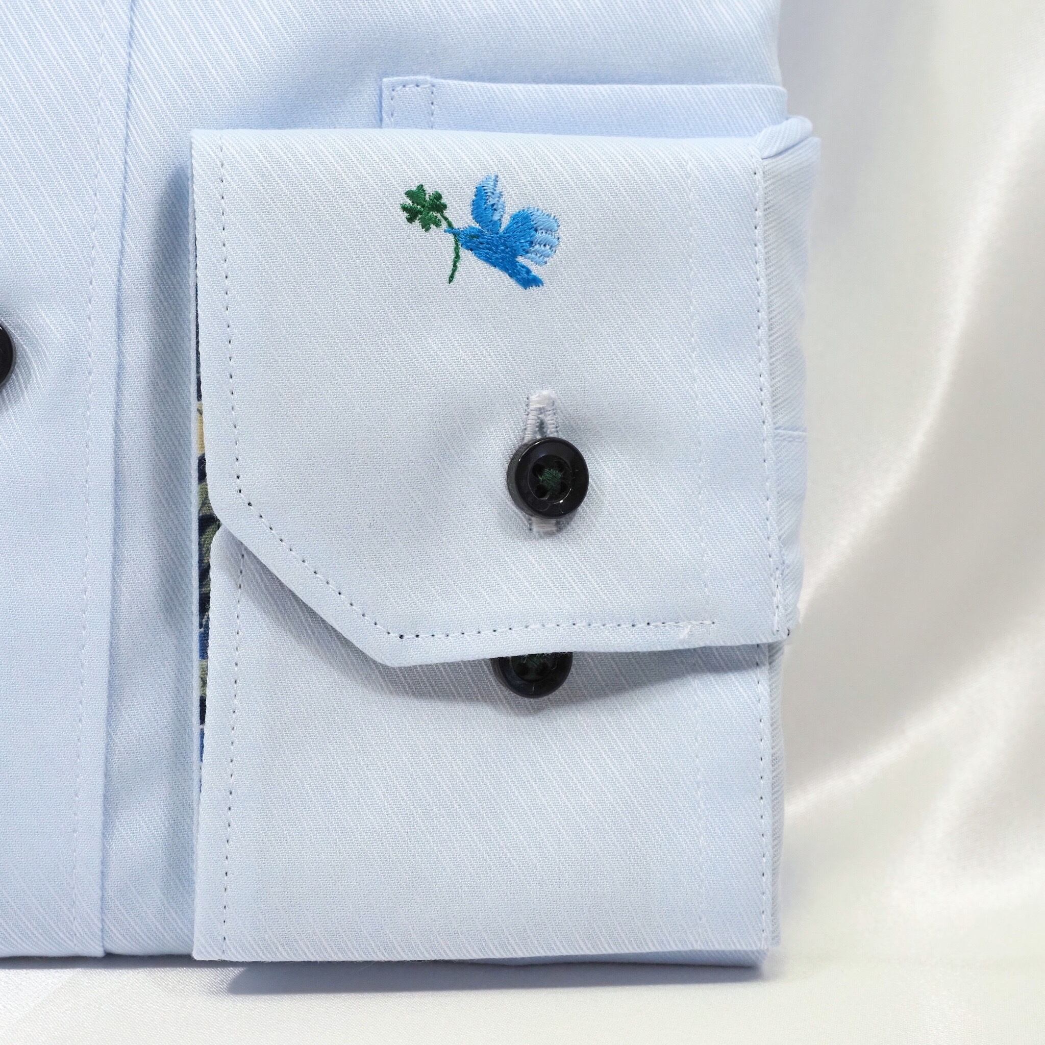 袖のブルーバード刺繍が、さりげない幸運のお守りに。