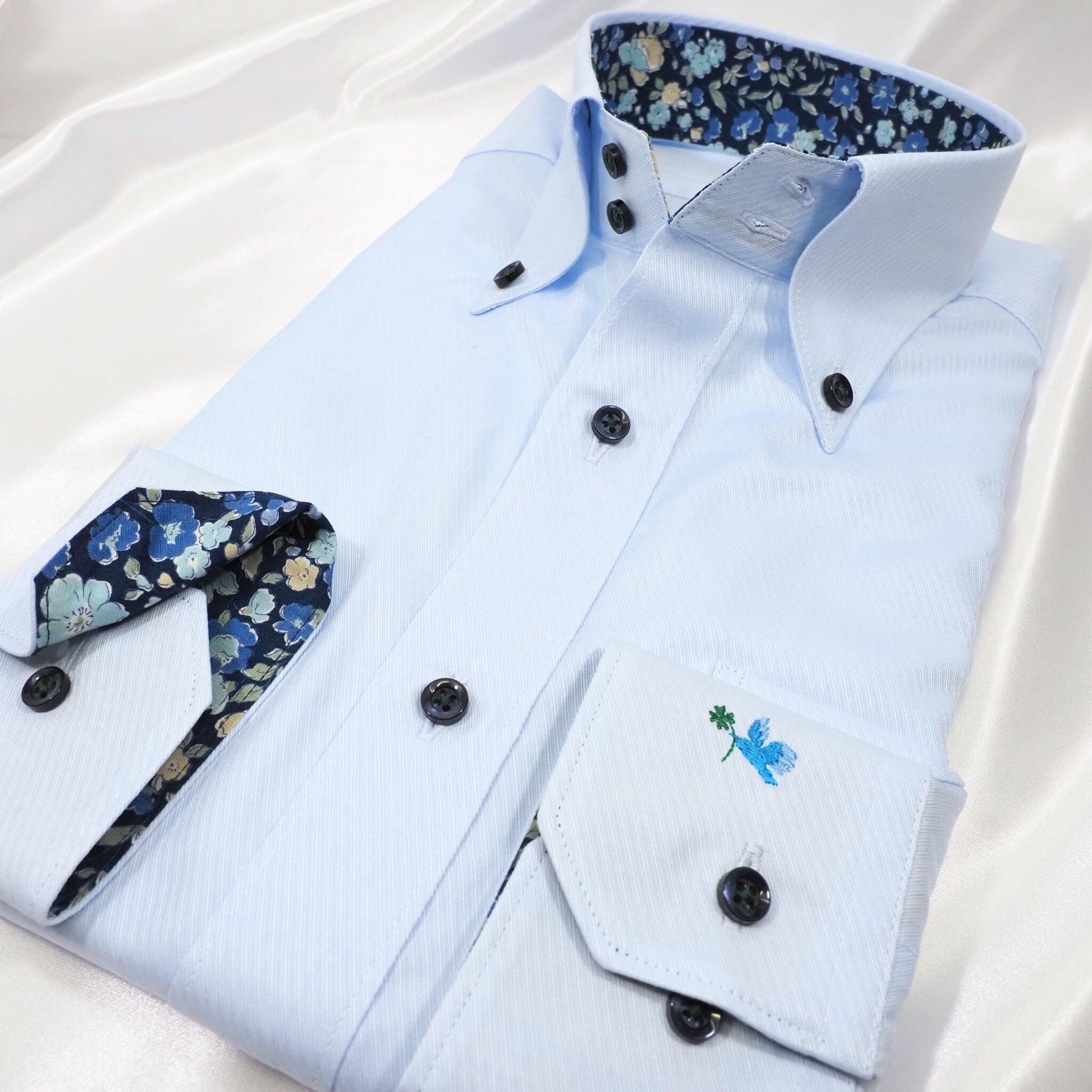 爽やかなサックスブルーに、ブルー×ベージュの小花柄裏地がよく映えます。
