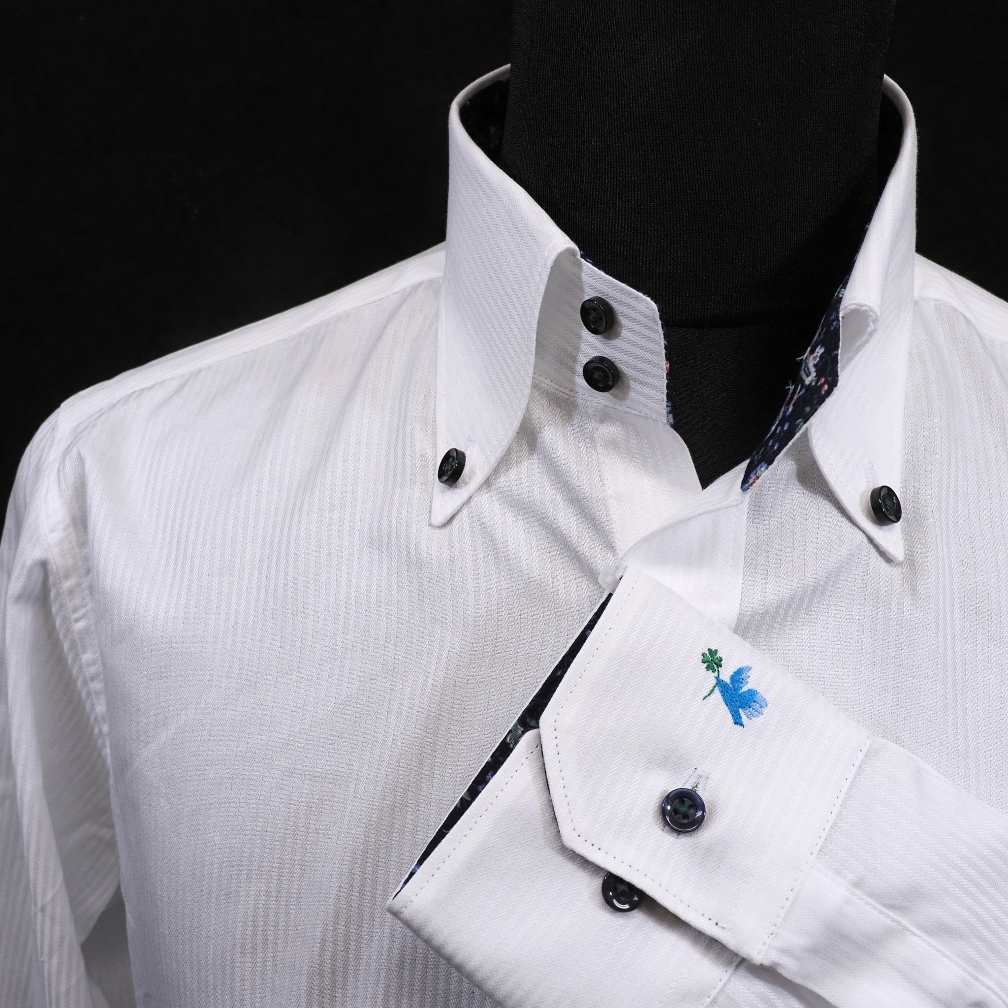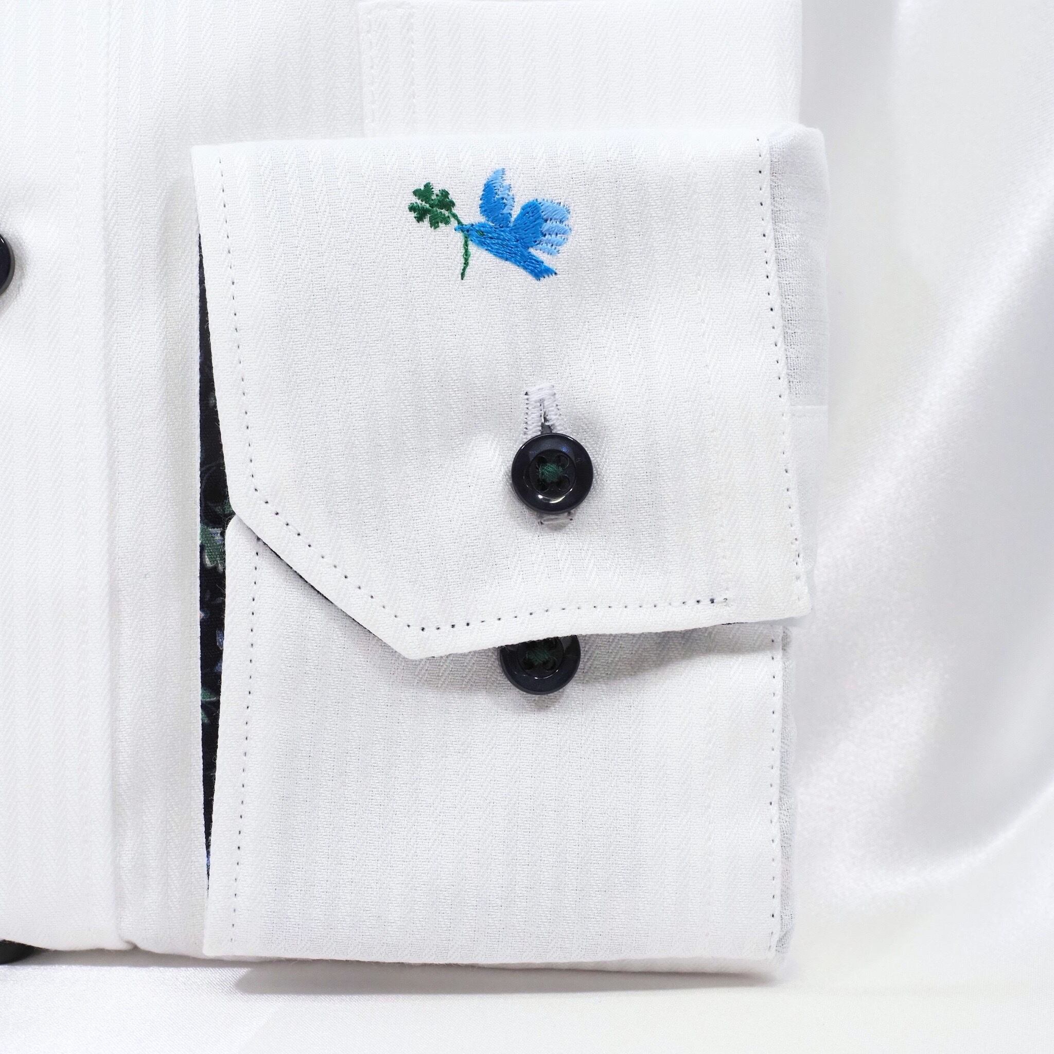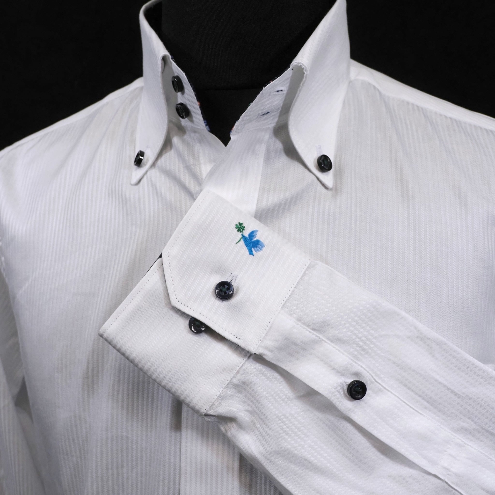 左袖にはクローバーをくわえたブルーバードの刺繍が。