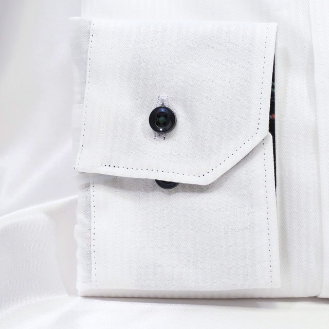 白のシャドーストライプ地に、黒ベースの小花柄を合わせた甘辛バランス。