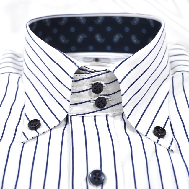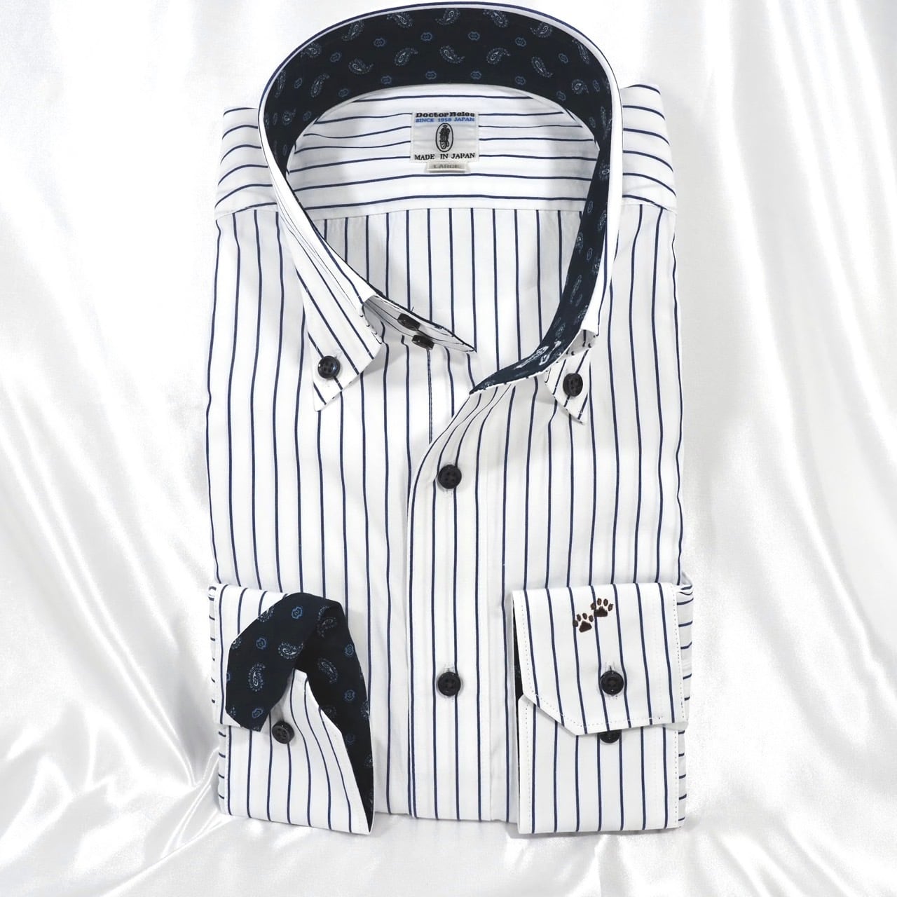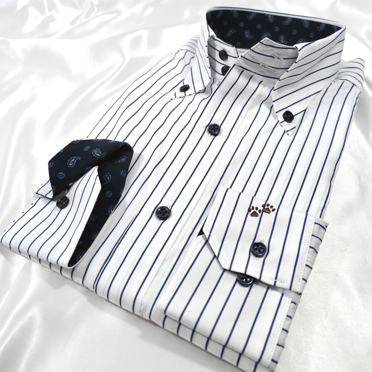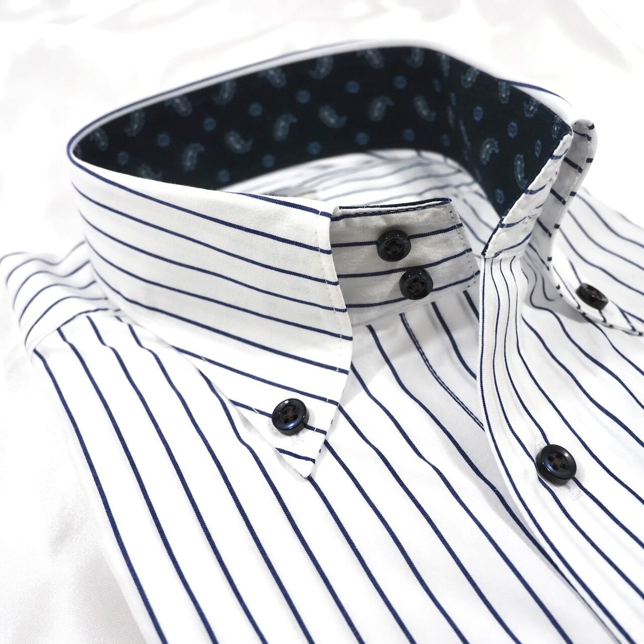 合わせやすい細めでインパクトもある紺ストライプ生地と、紺地に小紋ペイズリーの衿裏・カフス裏が特徴。