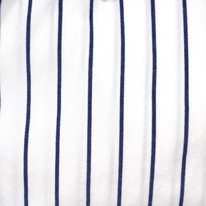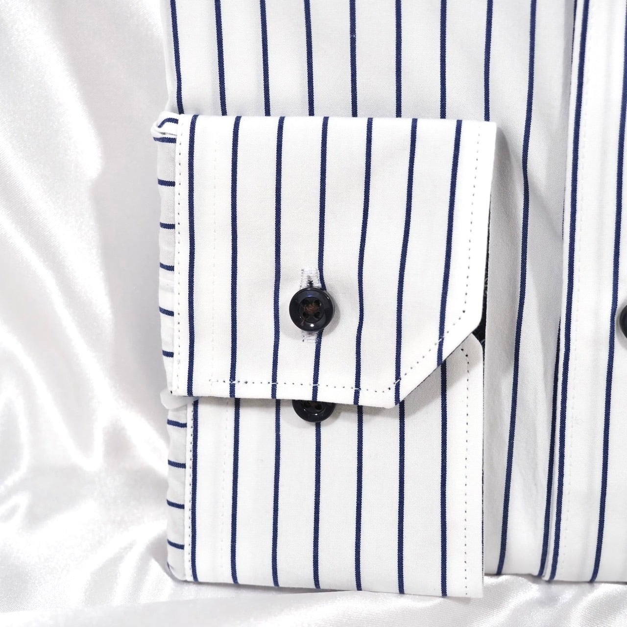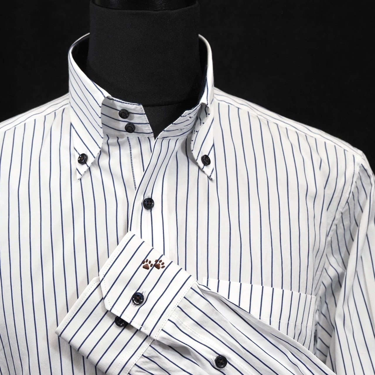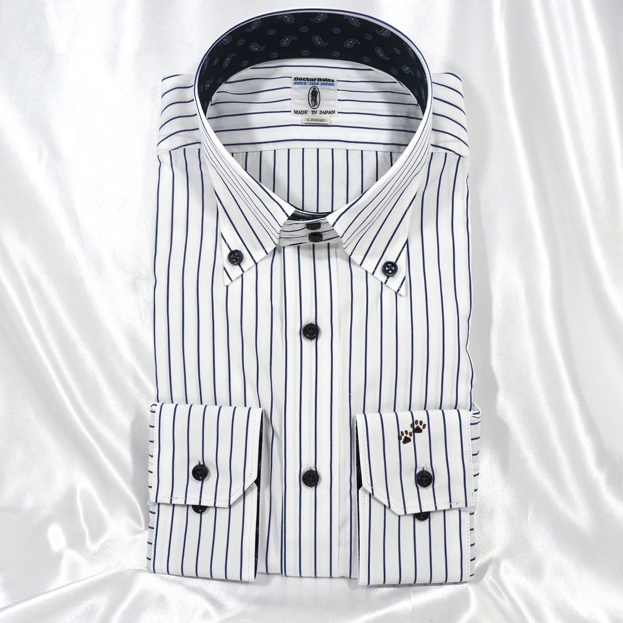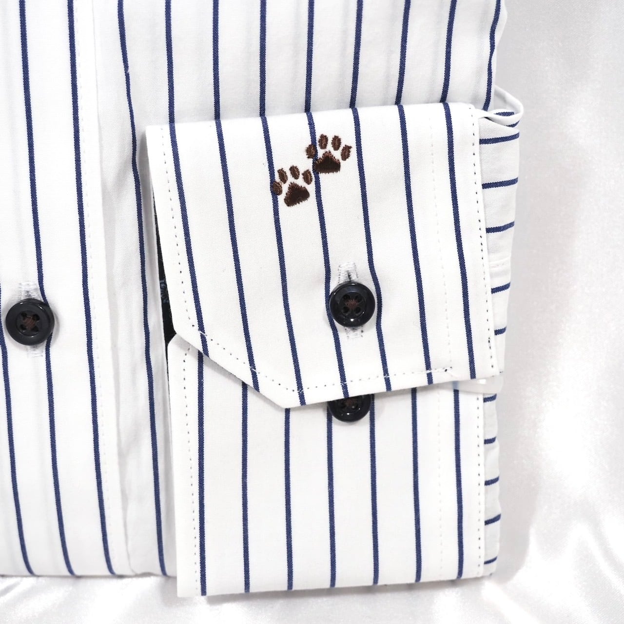 合わせやすい細めでインパクトもある紺ストライプ生地と、紺地に小紋ペイズリーの衿裏・カフス裏が特徴。