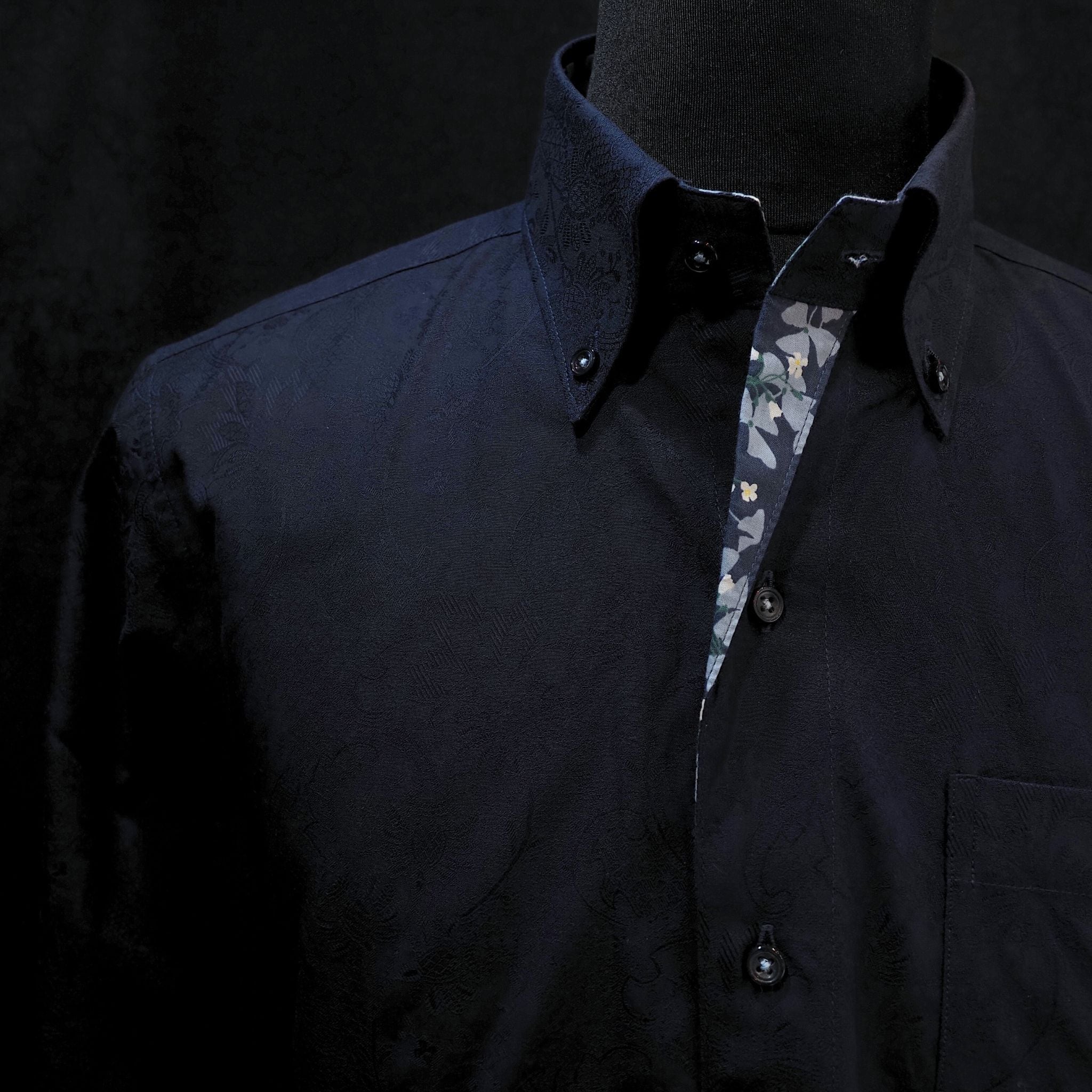 深みのあるネイビーに、襟元の花柄がさりげない華やかさをプラス。