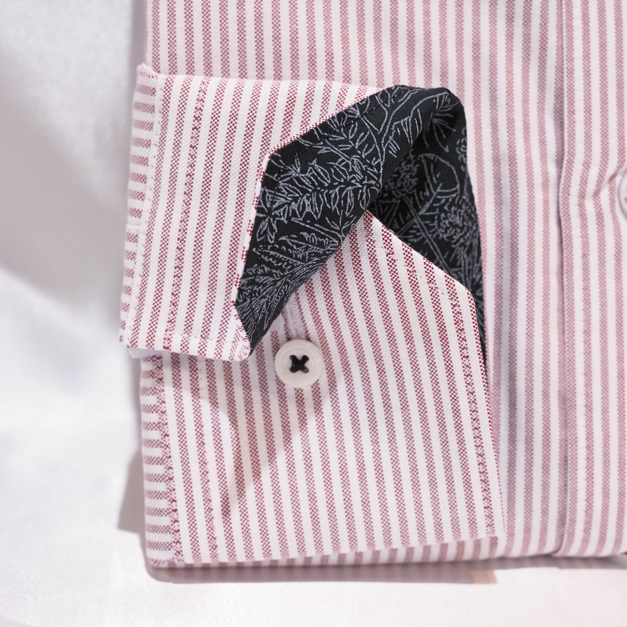 くすみレッドストライプが、肌なじみよく上品な印象。