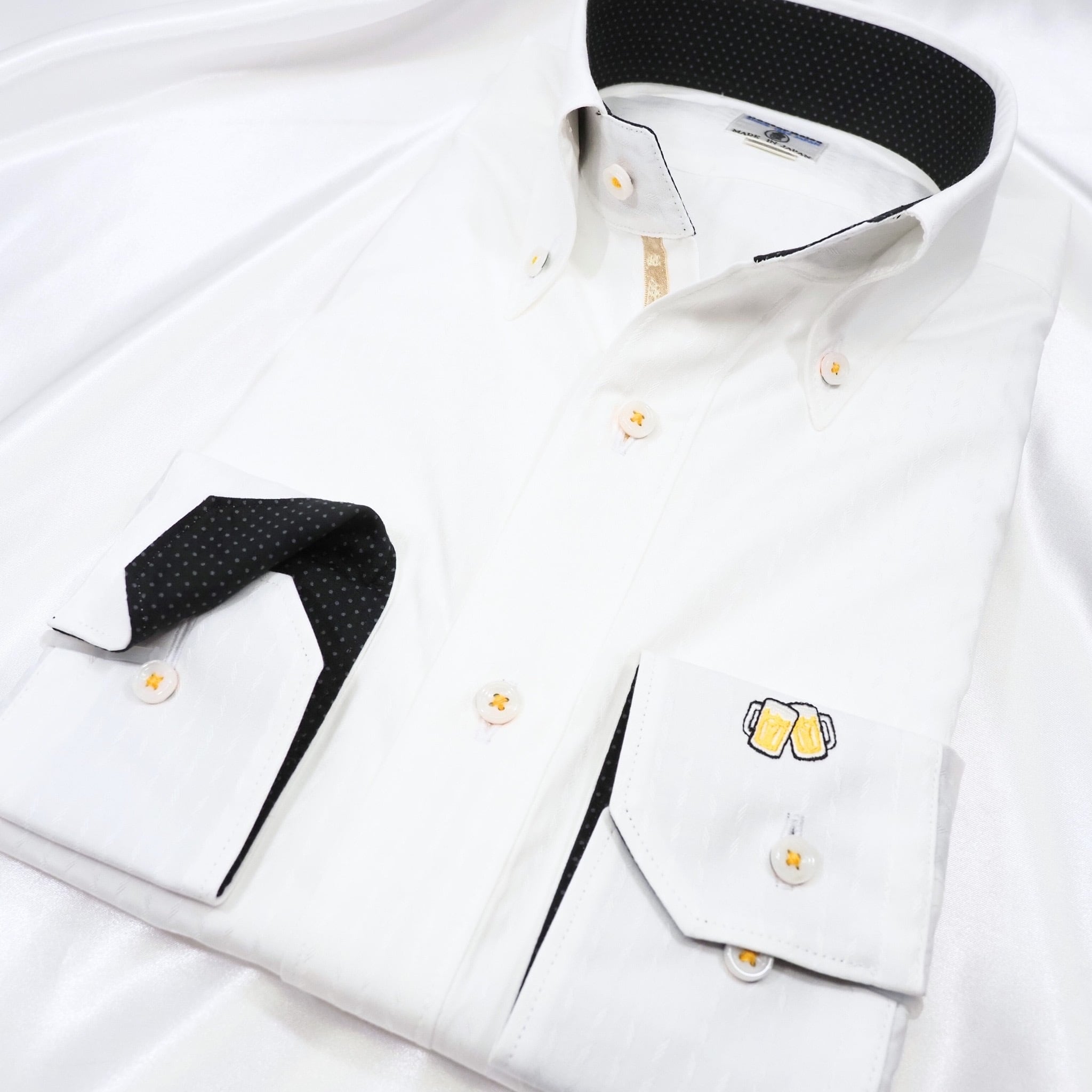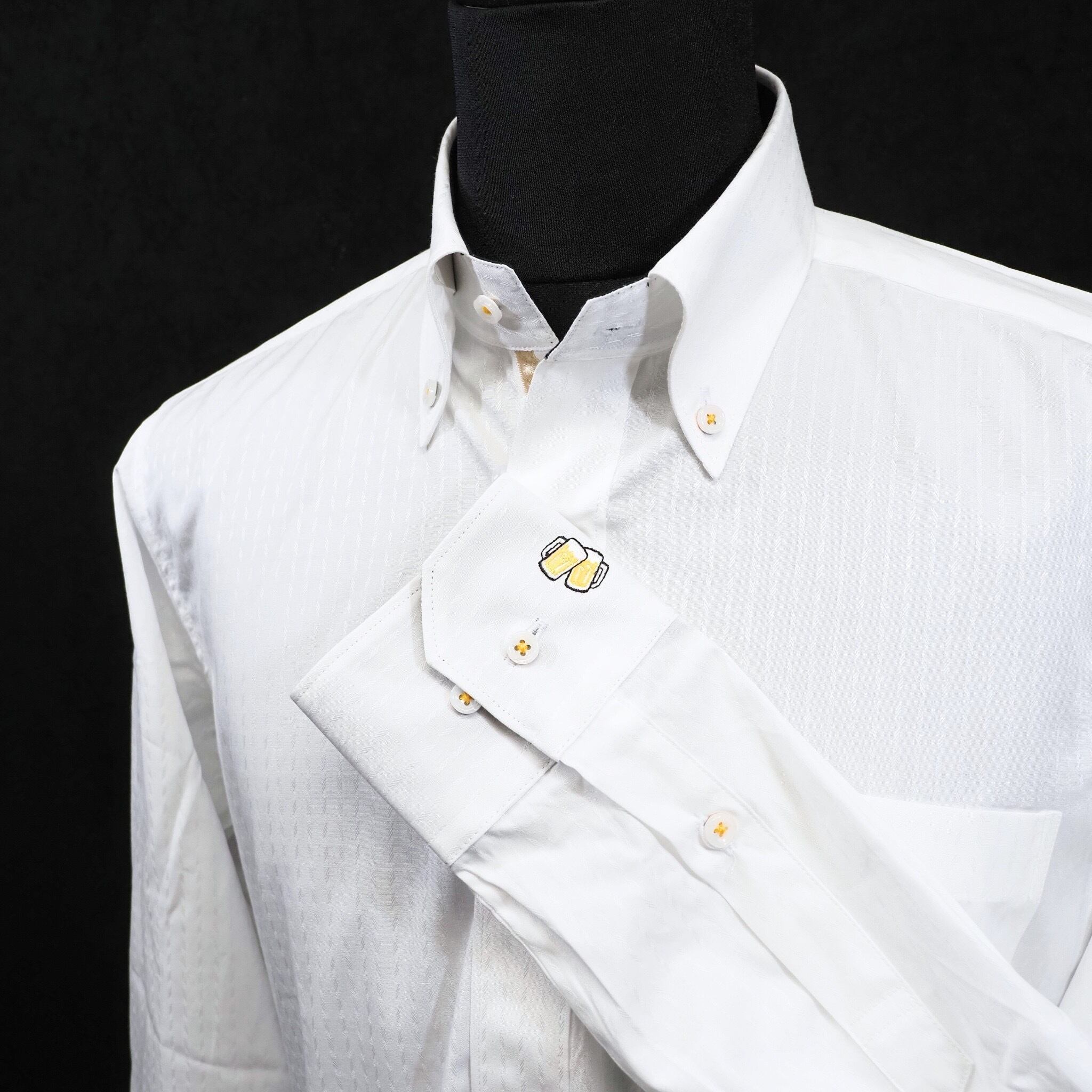 一見まじめな白シャツに、ポップな「ビール」刺繍をプラス。