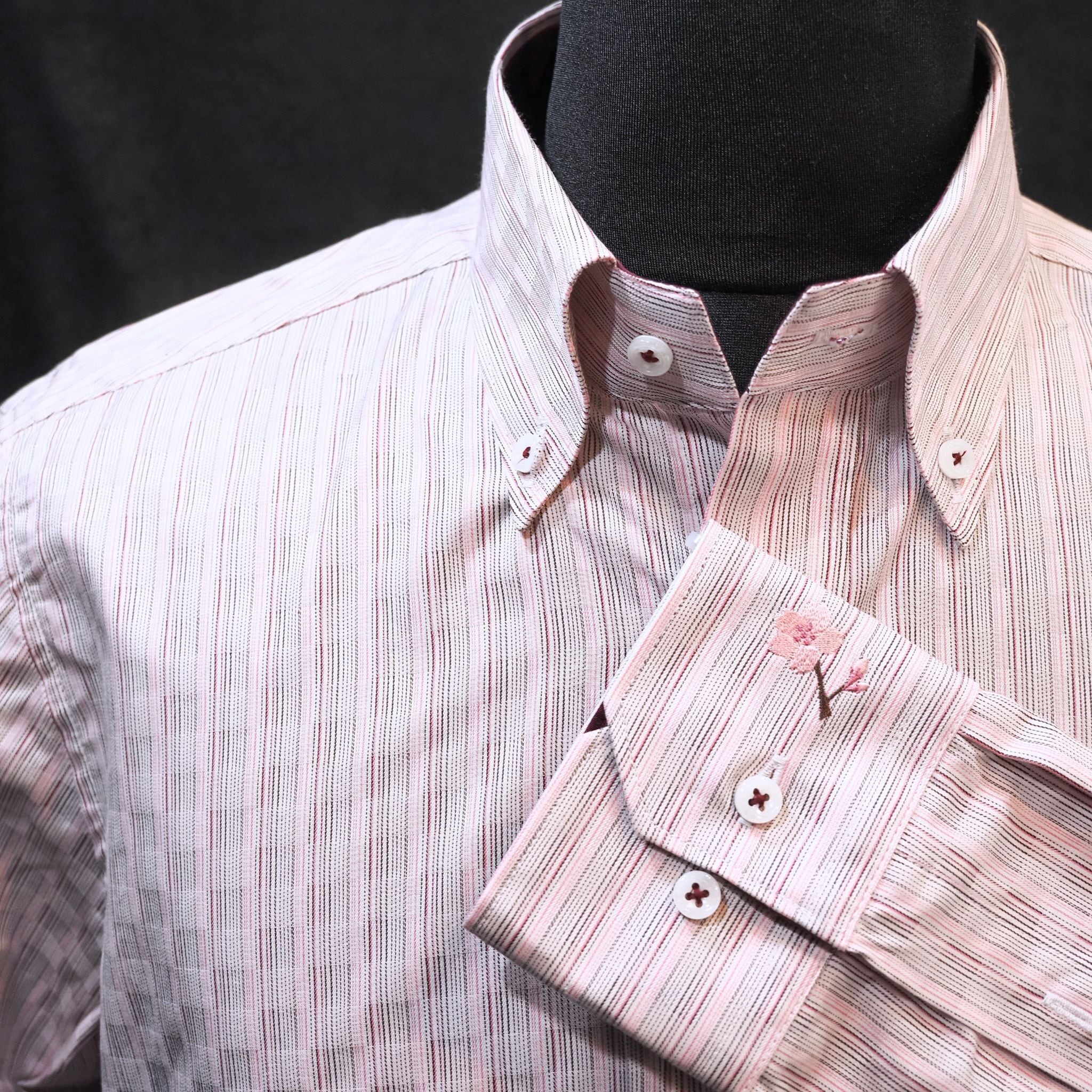 柔らかなピンクストライプに、新たにデビューした桜刺繍が優しく映えるシャツ。