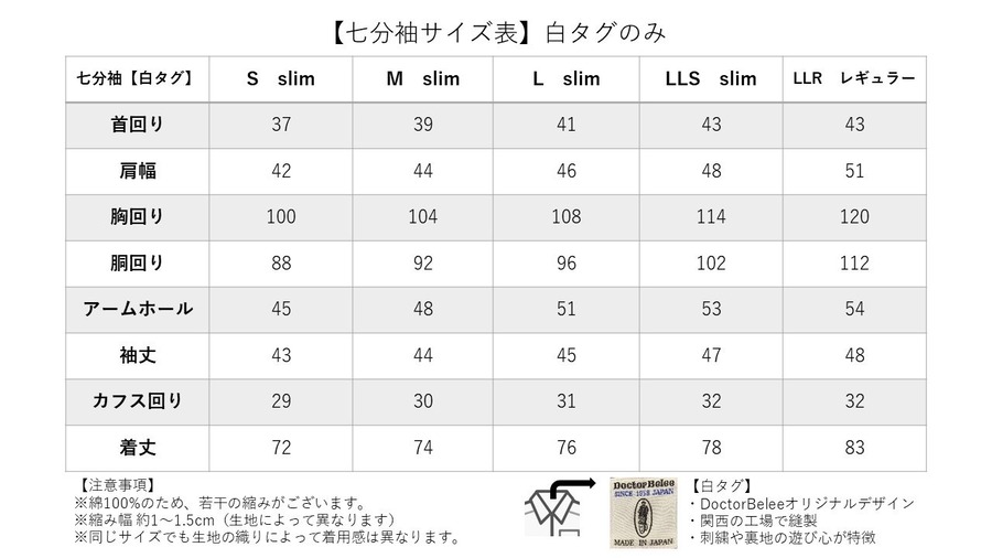 ※こちらの七分袖はスリムフィットのサイズになります。初めての方は必ずサイズをご確認下さい。