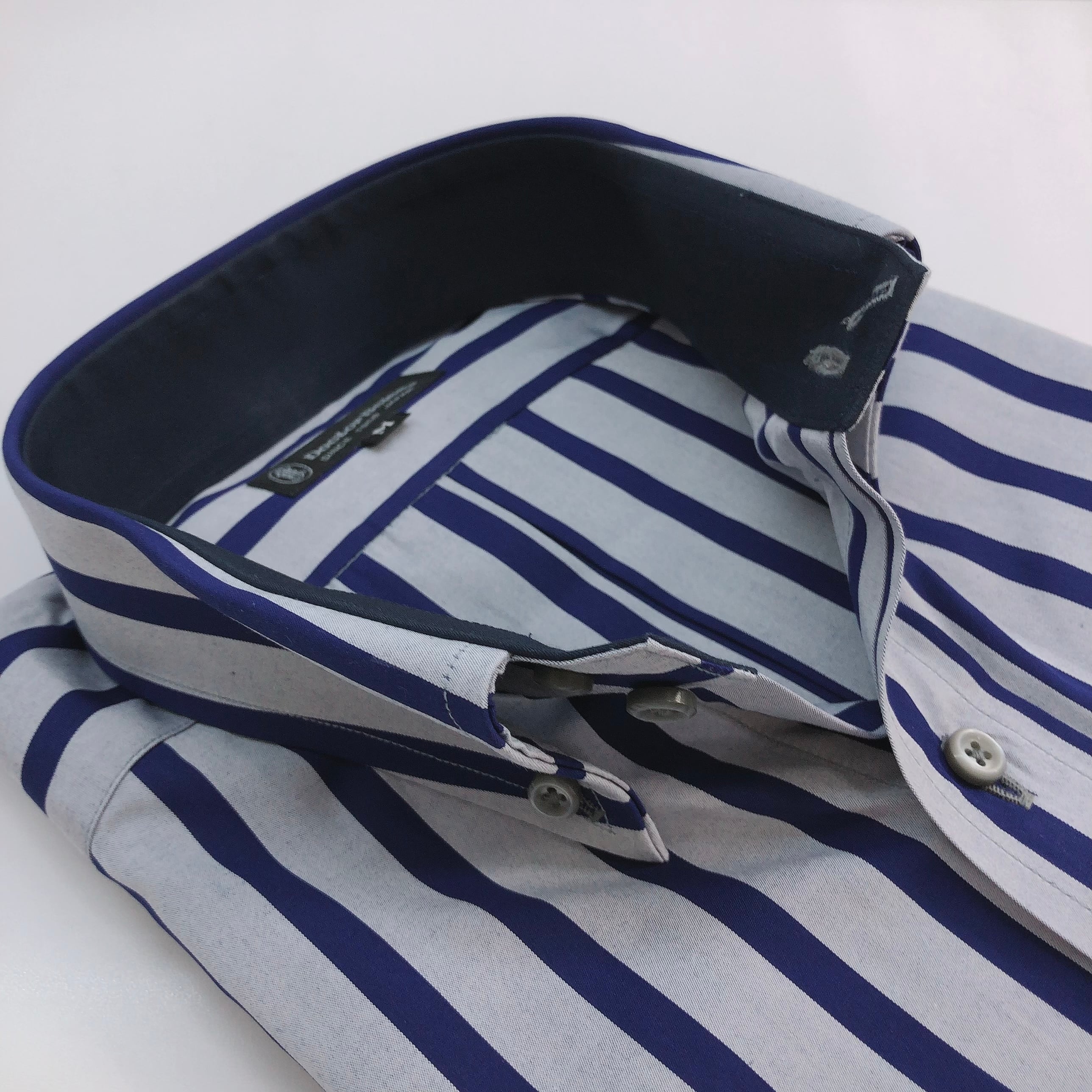 こちらのシャツはグレーベースに青に近い紺、太目のストライプなので