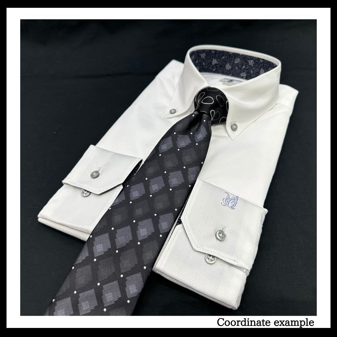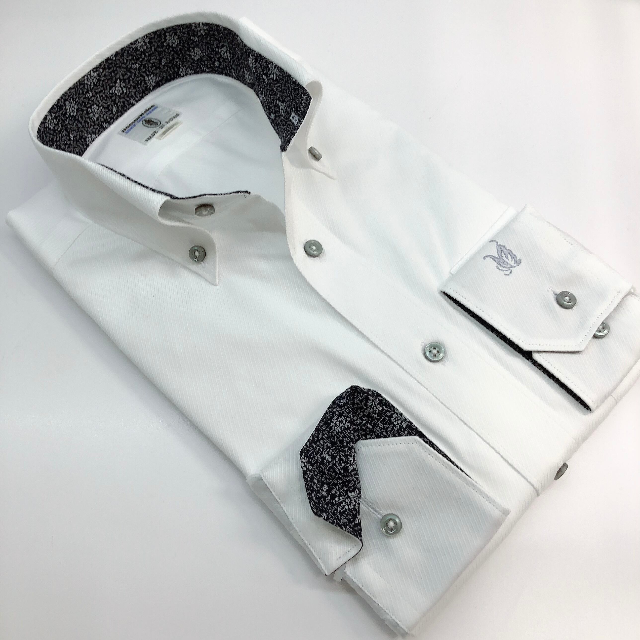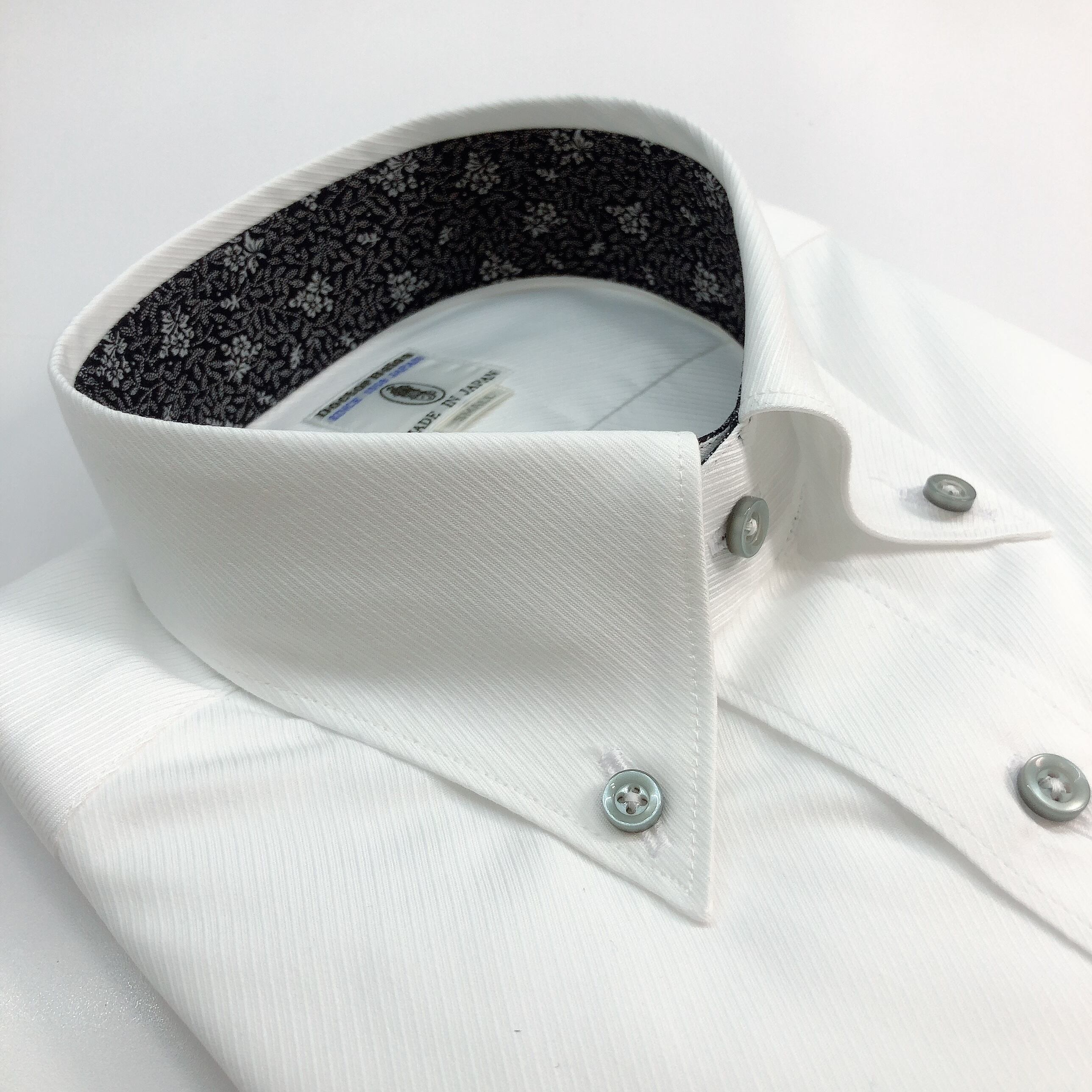 シンプルめな織り柄の白生地にグレーボタンが光るシャツです。