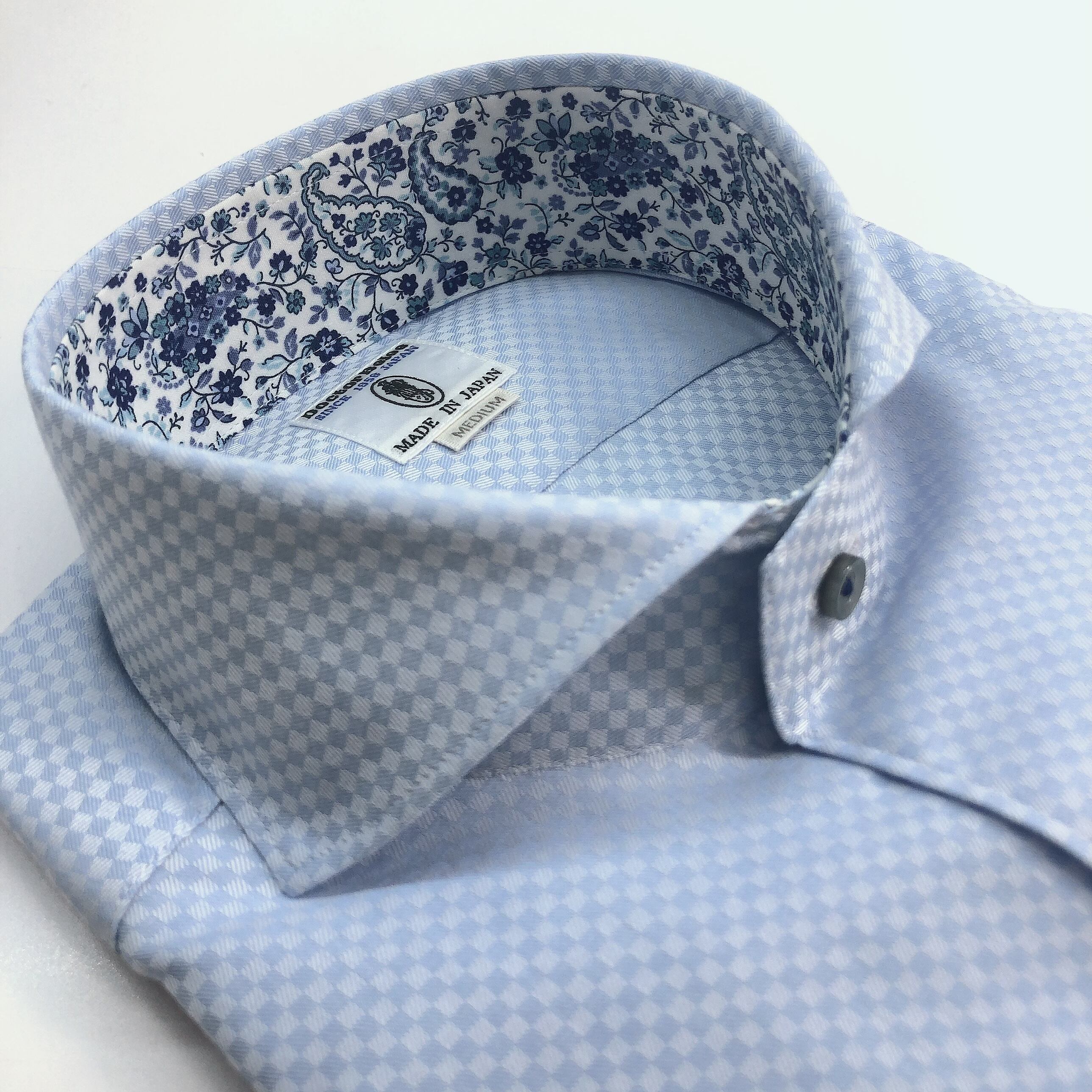 サックスの生地に青のボタニカル/ペイズリー柄の裏地が映え、華やかさをプラスします。