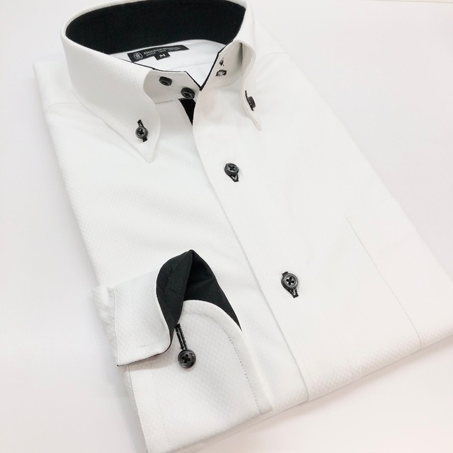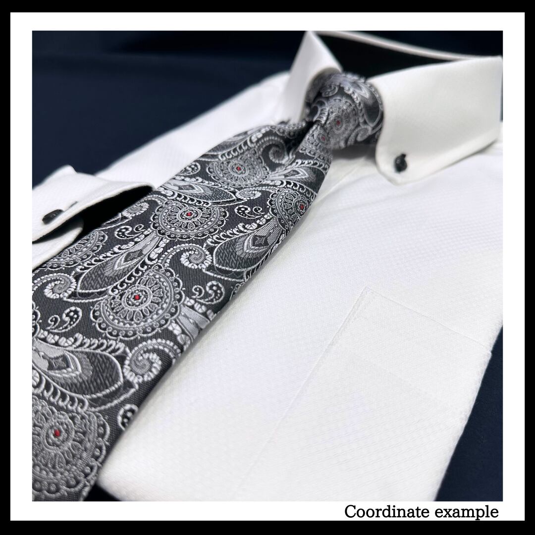 白シャツなので合わせるコーディネート幅は広いですが、このシャツのポイントカラーは黒なのでネクタイを合わせる際は”モノトーン系”を使うとコーディネートに統一感が生まれます♪