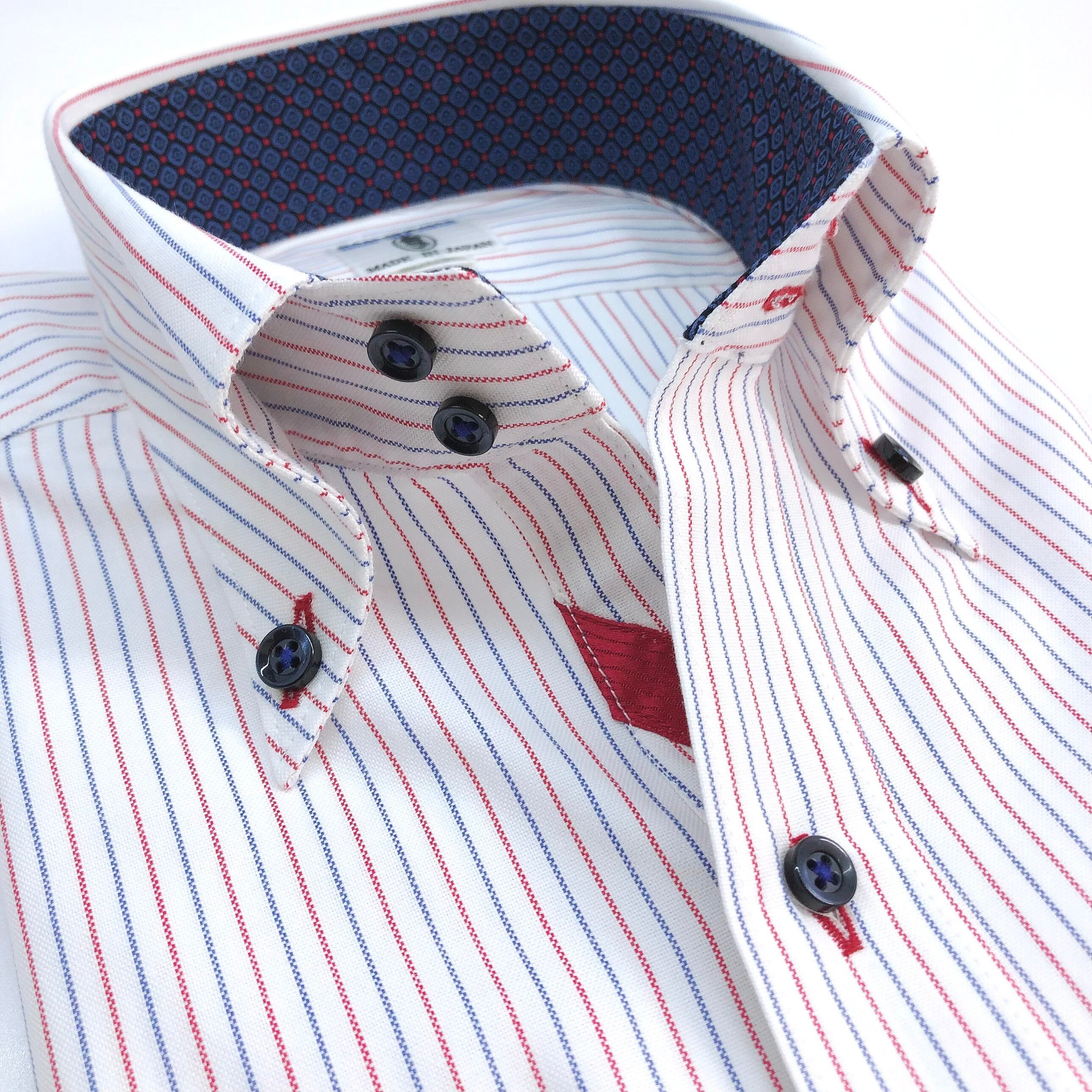 ボタンを開けた胸元の赤いテープがアクセントになり、ノータイでの着用もおすすめな1着です♪