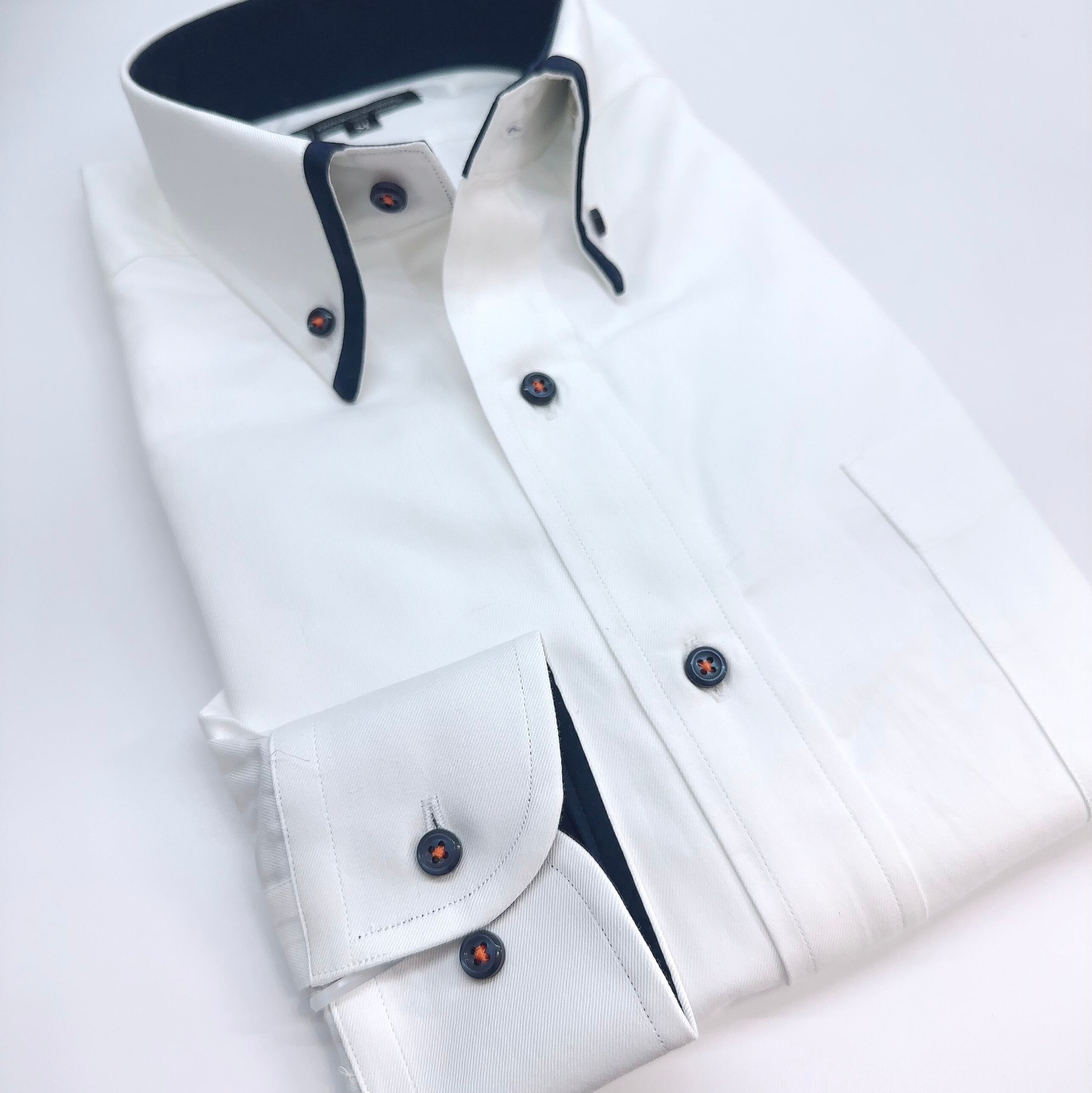 衿先のネイビーカラーポイントの衿先ジョイントシャツ。