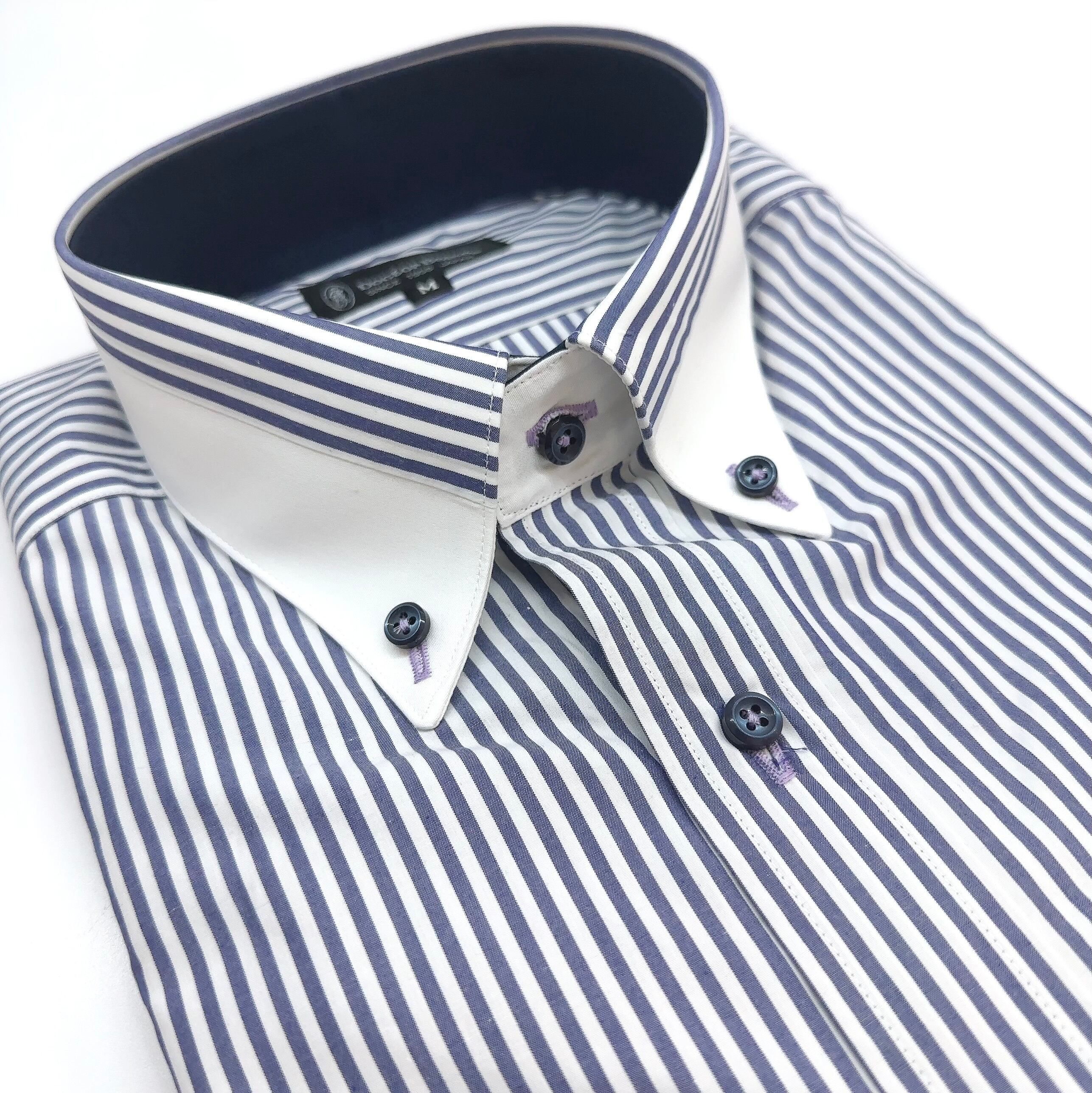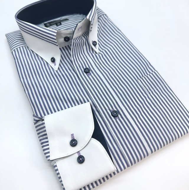 生地のストライプは花紺色で柔らかさを出し、カフス衿裏、ボタンは紺、