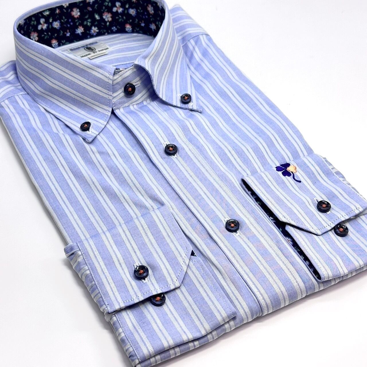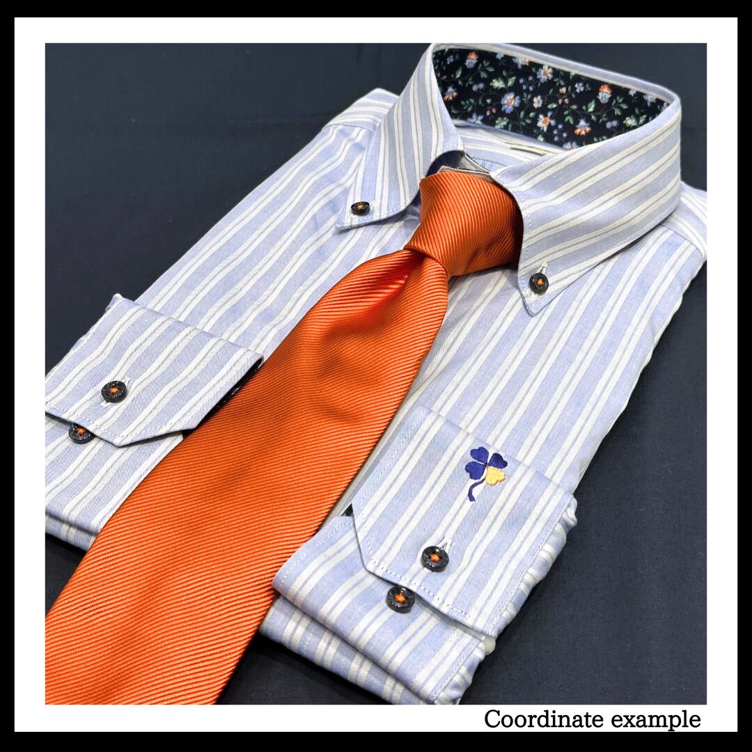 袖口のクローバー刺繍・衿・カフス裏・ボタン・留め糸のカラーをすべてネイビー×オレンジでまとめました。