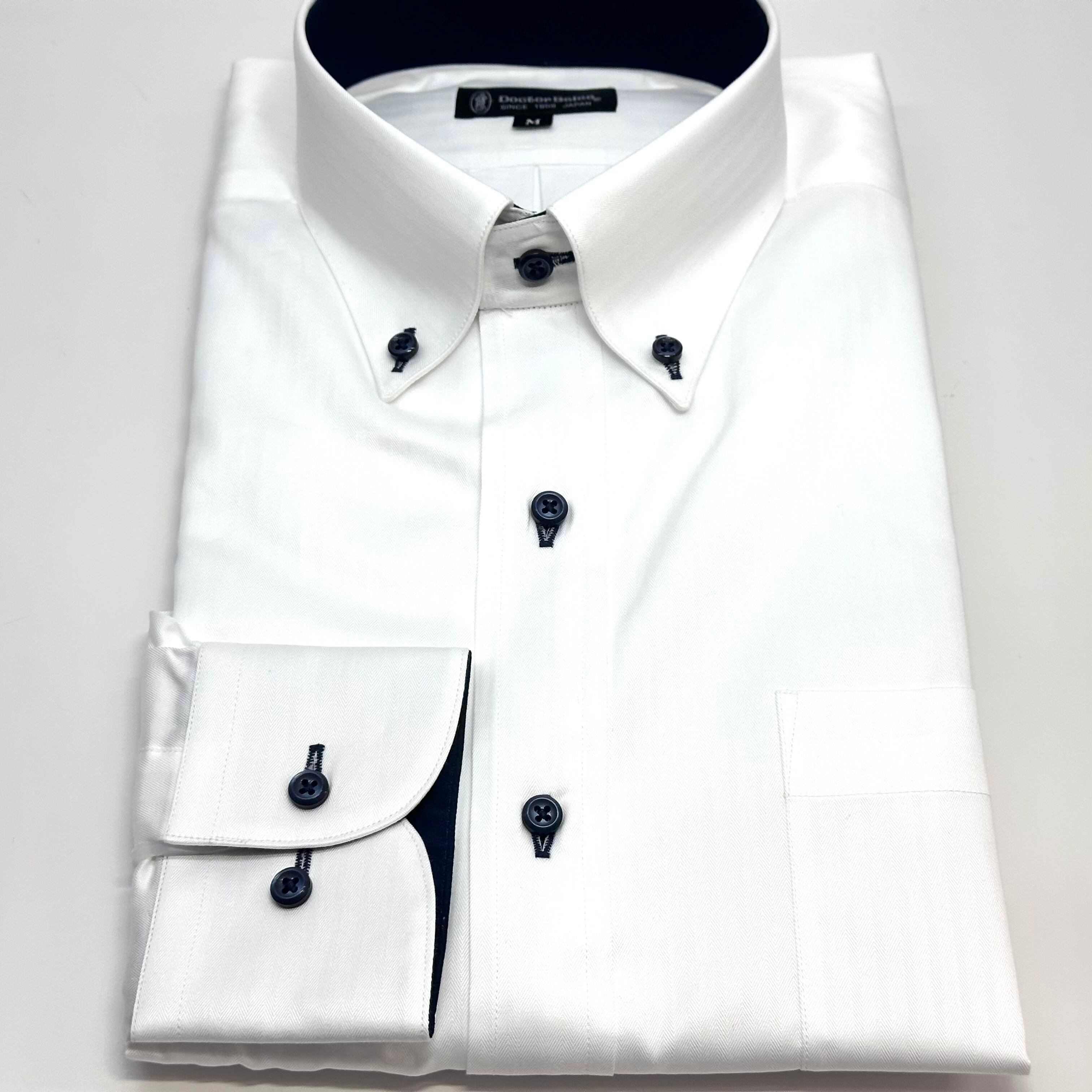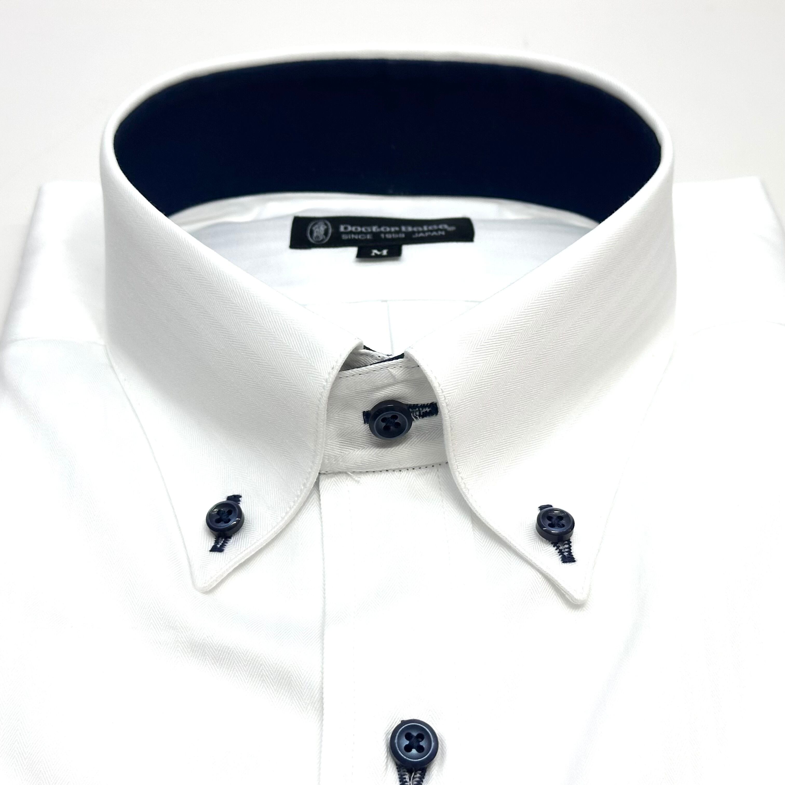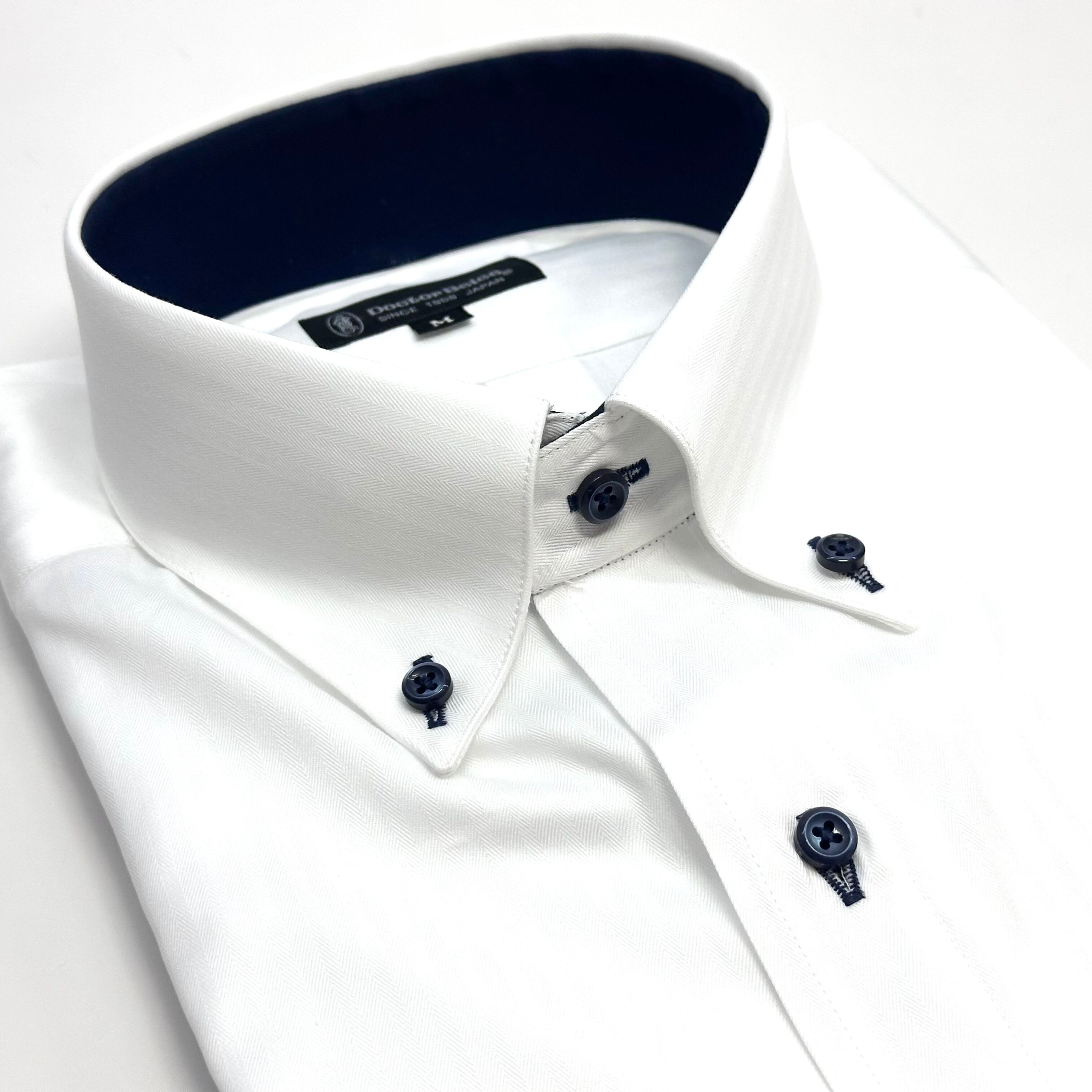 胸元テープ・衿・カフス裏・ボタン・留め糸すべてのポイントが紺で統一しております。