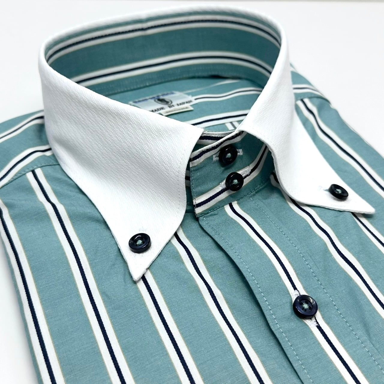 ターコイズにグリーンを合わせた感じの色、シロ&ネイビーストライプがシャープな