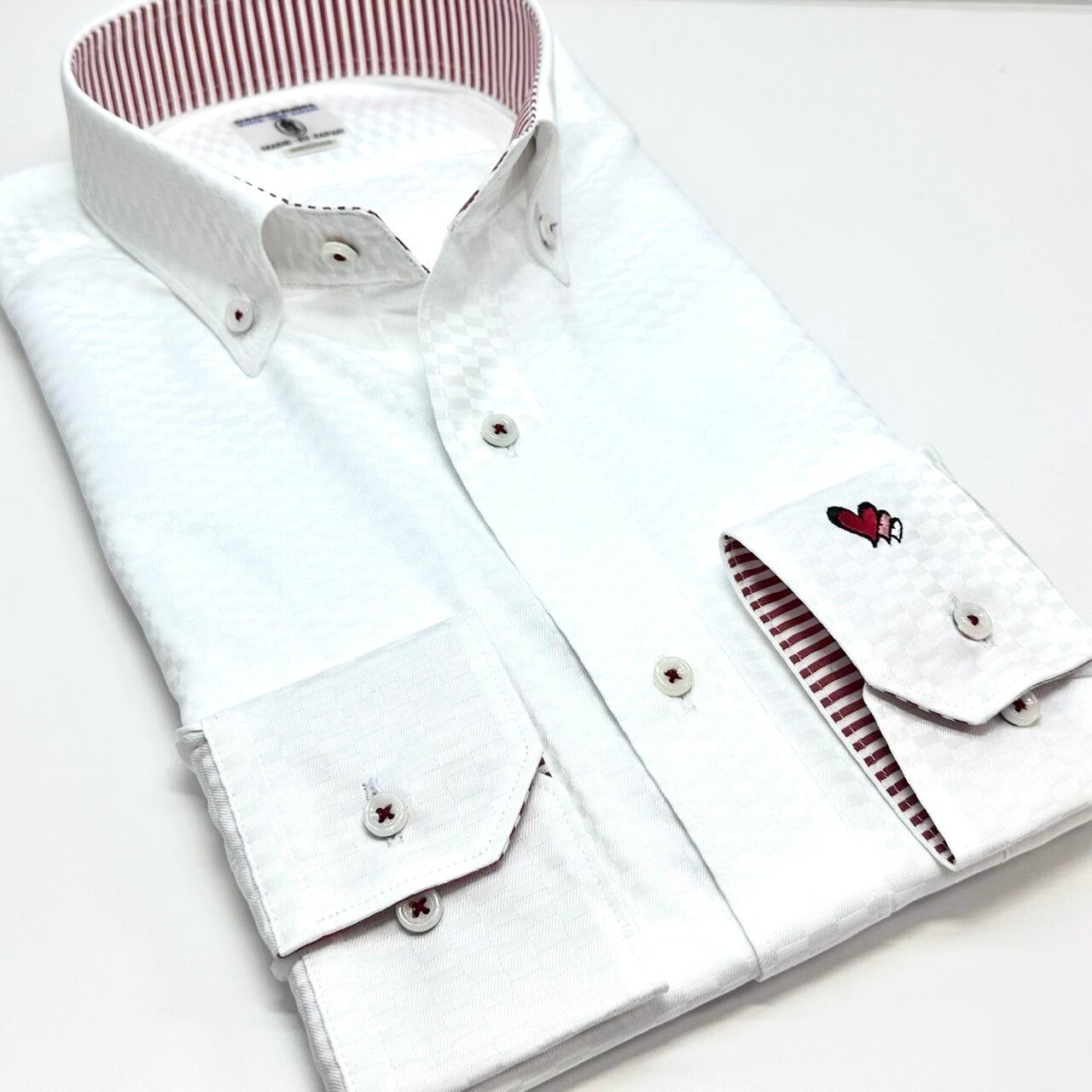 白地のシャツでポイントカラーが赤になっているので、チラッと見えた時に存在感のあるアクセントになります。
