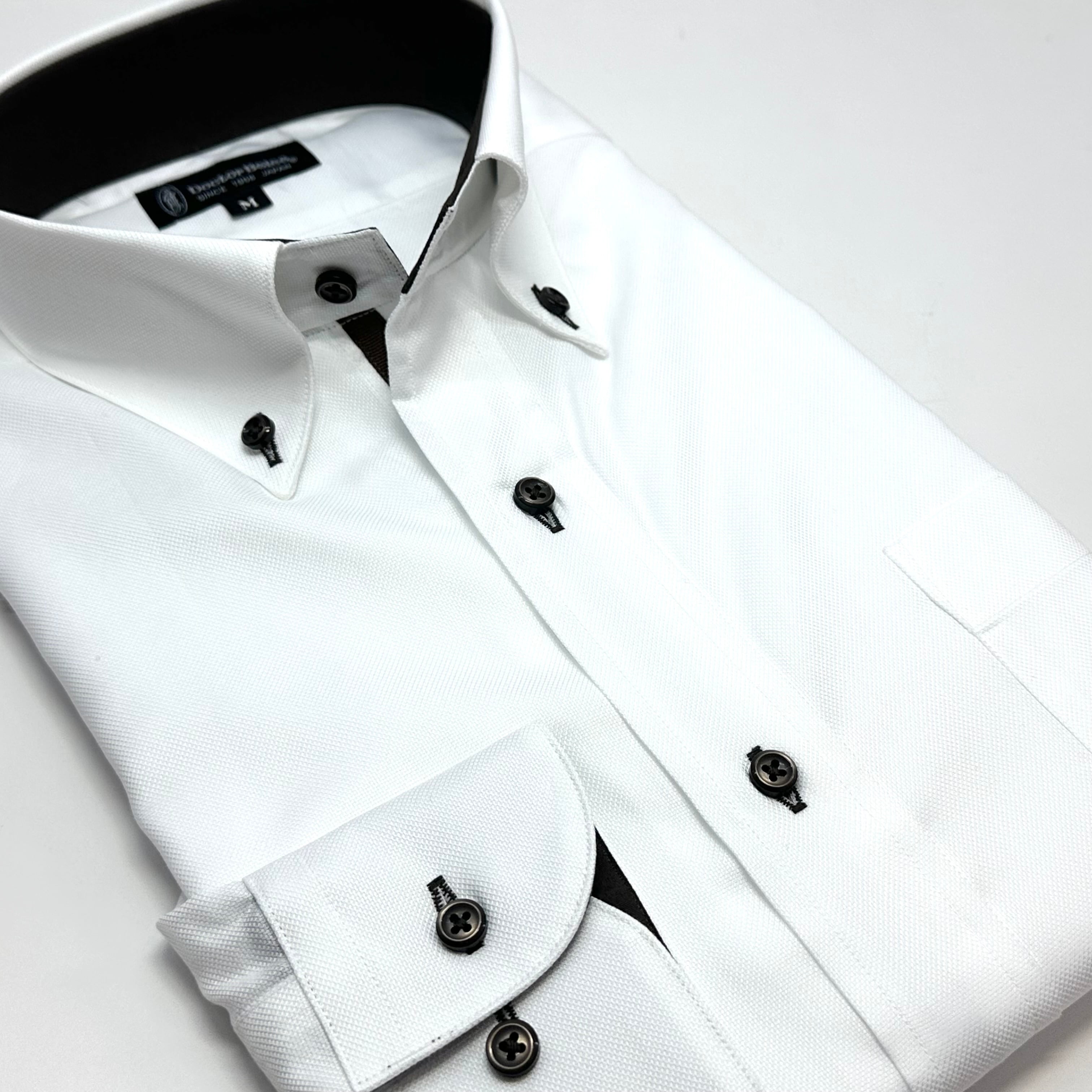 胸元テープ・衿・カフス裏・ボタン・留め糸すべてのポイントが茶で統一しております。