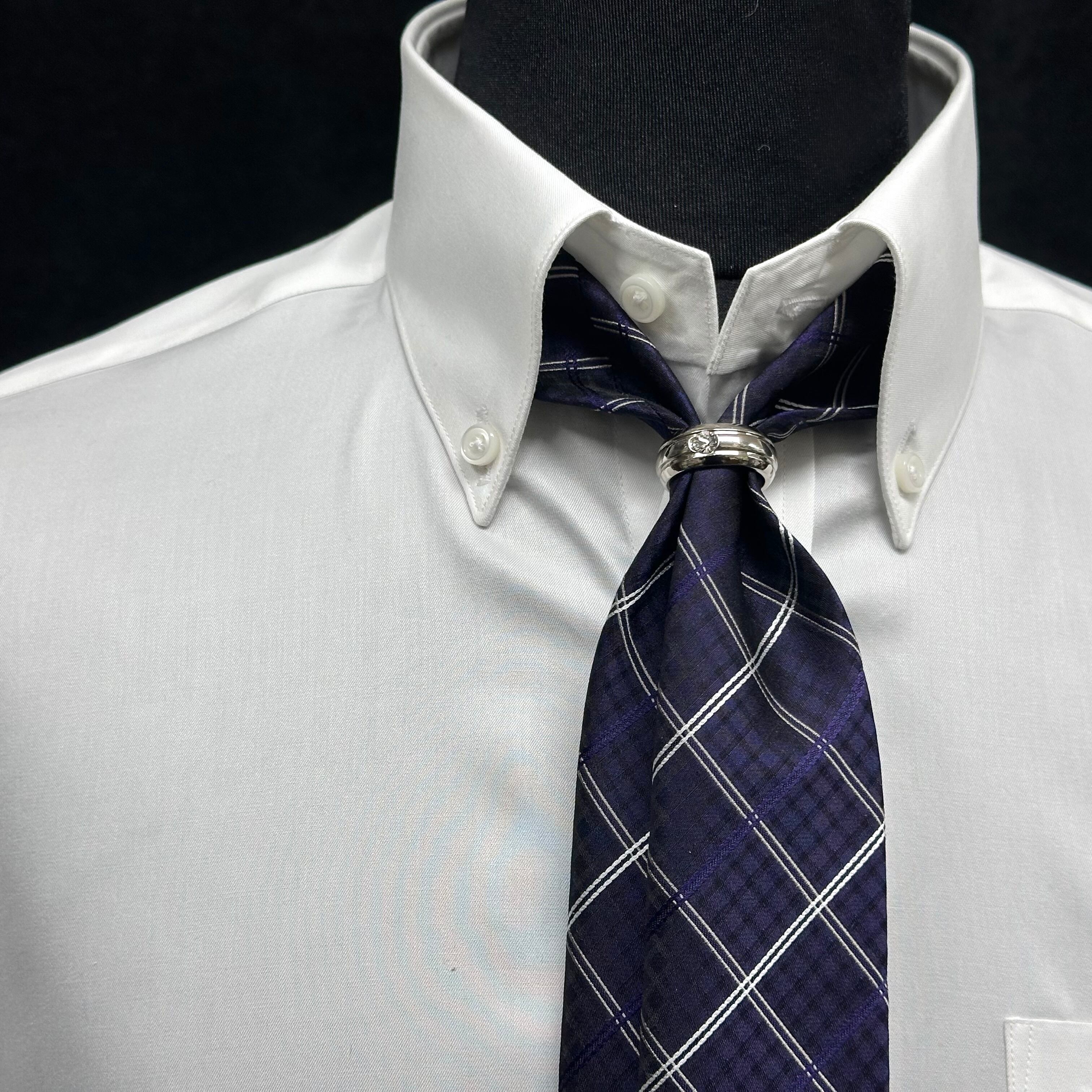 1.リングにネクタイを通すだけのヌケ感を演出するスカーフ風結び。
